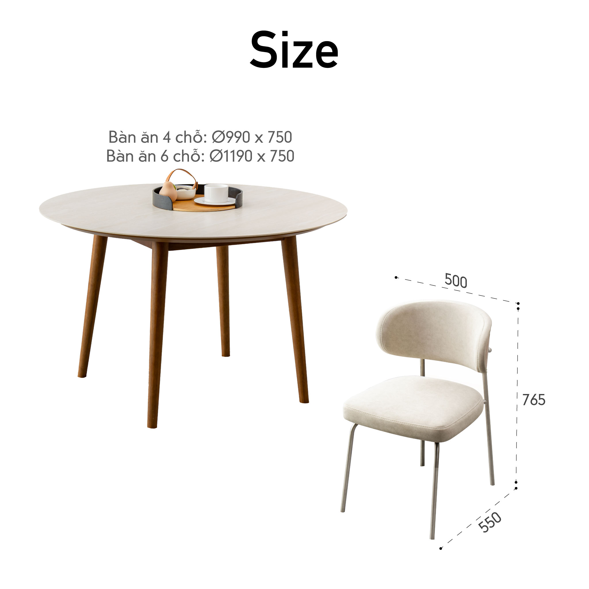 Mặt bàn Ceramic màu Beige sang trọng với hai kích thước Ø990 và Ø1190, dễ dàng hòa hợp với nhiều phong cách nội thất khác nhau. Ghế có hai gam màu: Grey trung tính và Beige sang trọng – mang đến nhiều lựa chọn phù hợp với sở thích của từng khách hàng.