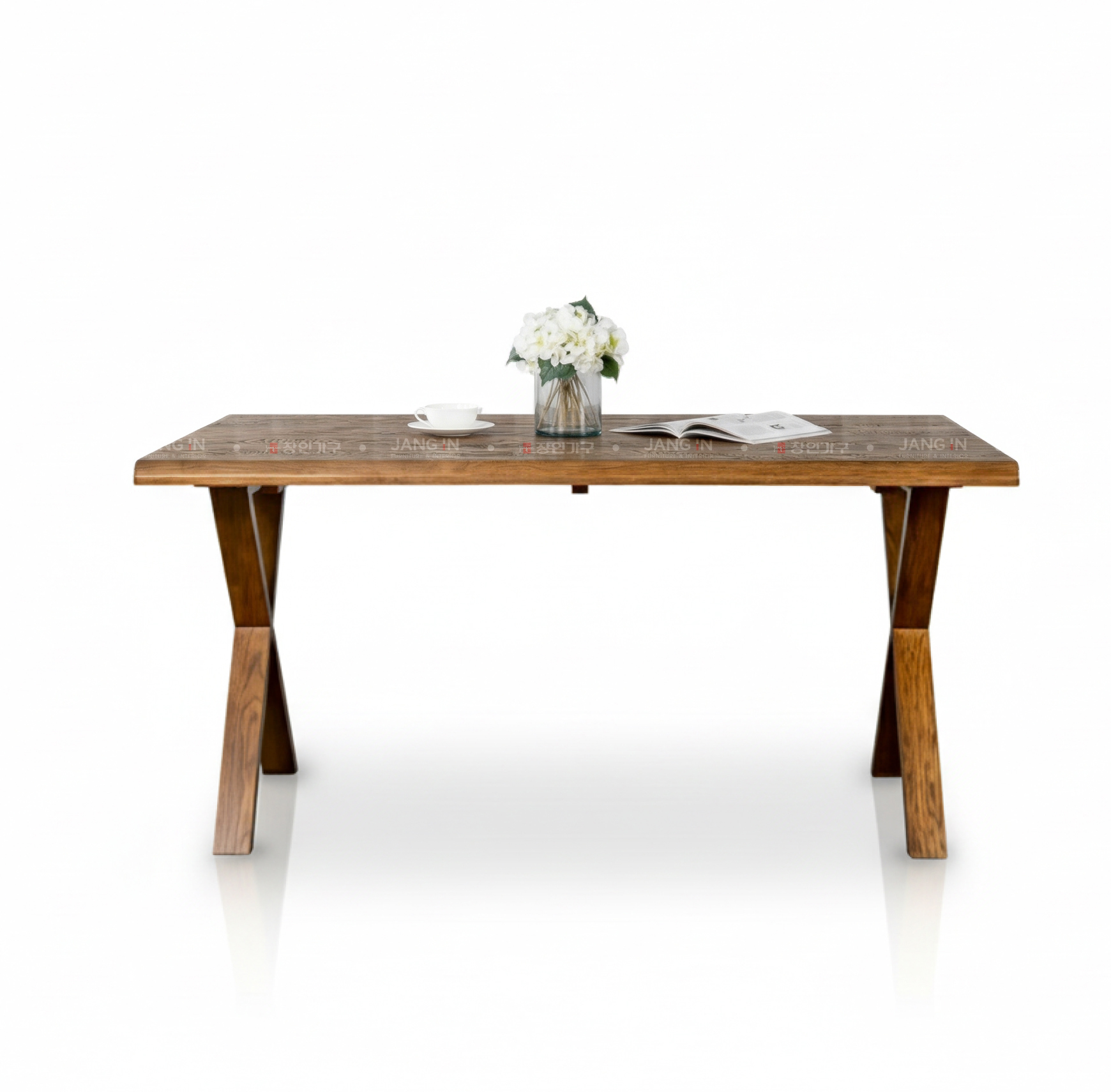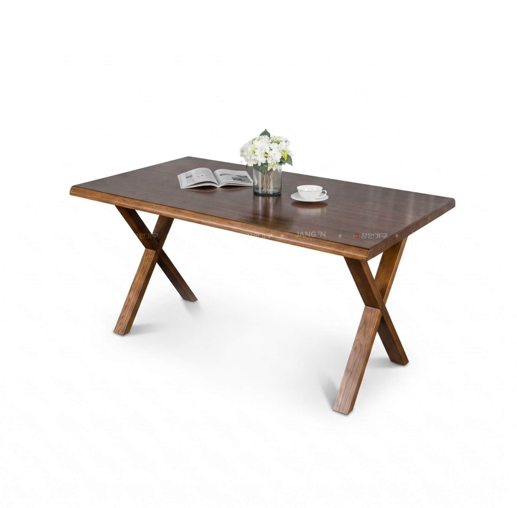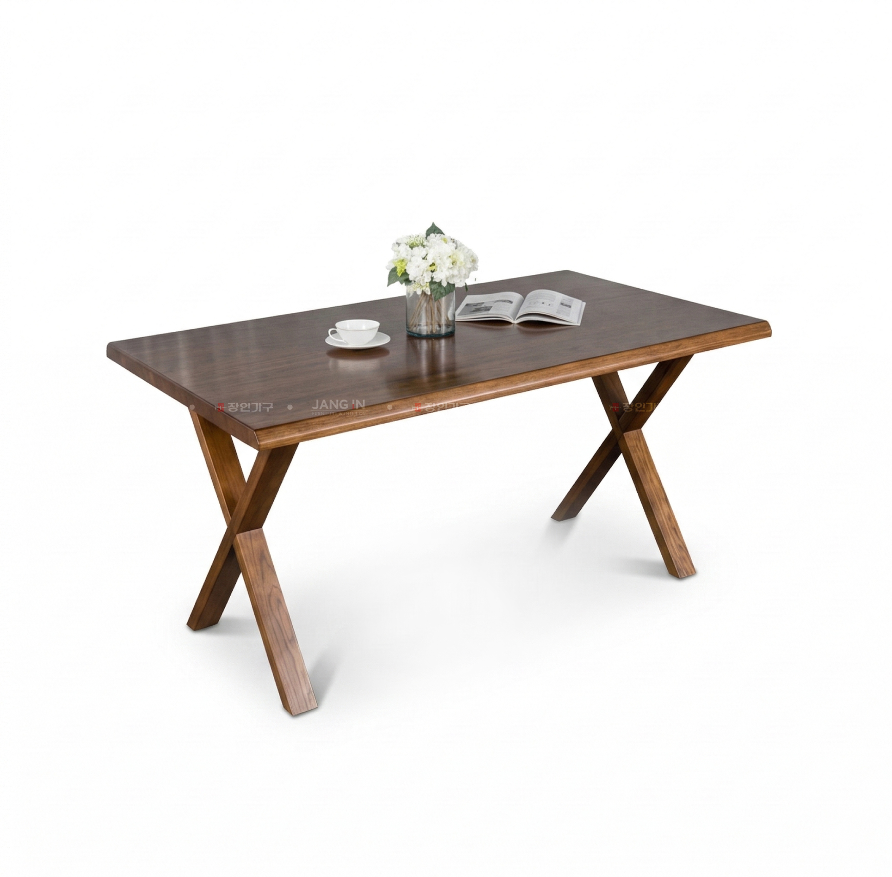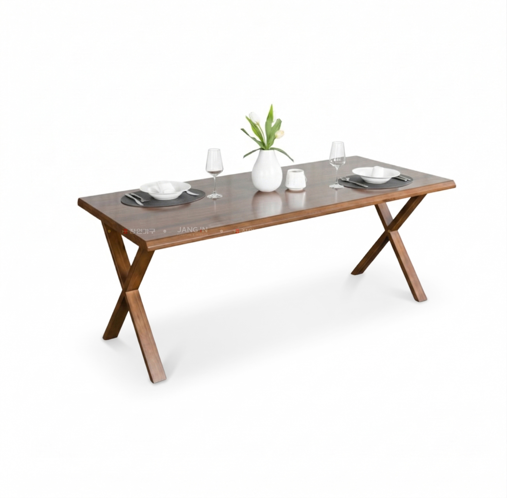 Thiết kế chân bàn chữ X độc đáo không chỉ tăng độ ổn định mà còn mang lại cảm giác mở rộng, thoáng đãng cho phòng ăn. Màu nâu gỗ ấm giúp không gian phòng ăn thêm đầm ấm cho những bữa cơm gia đình.