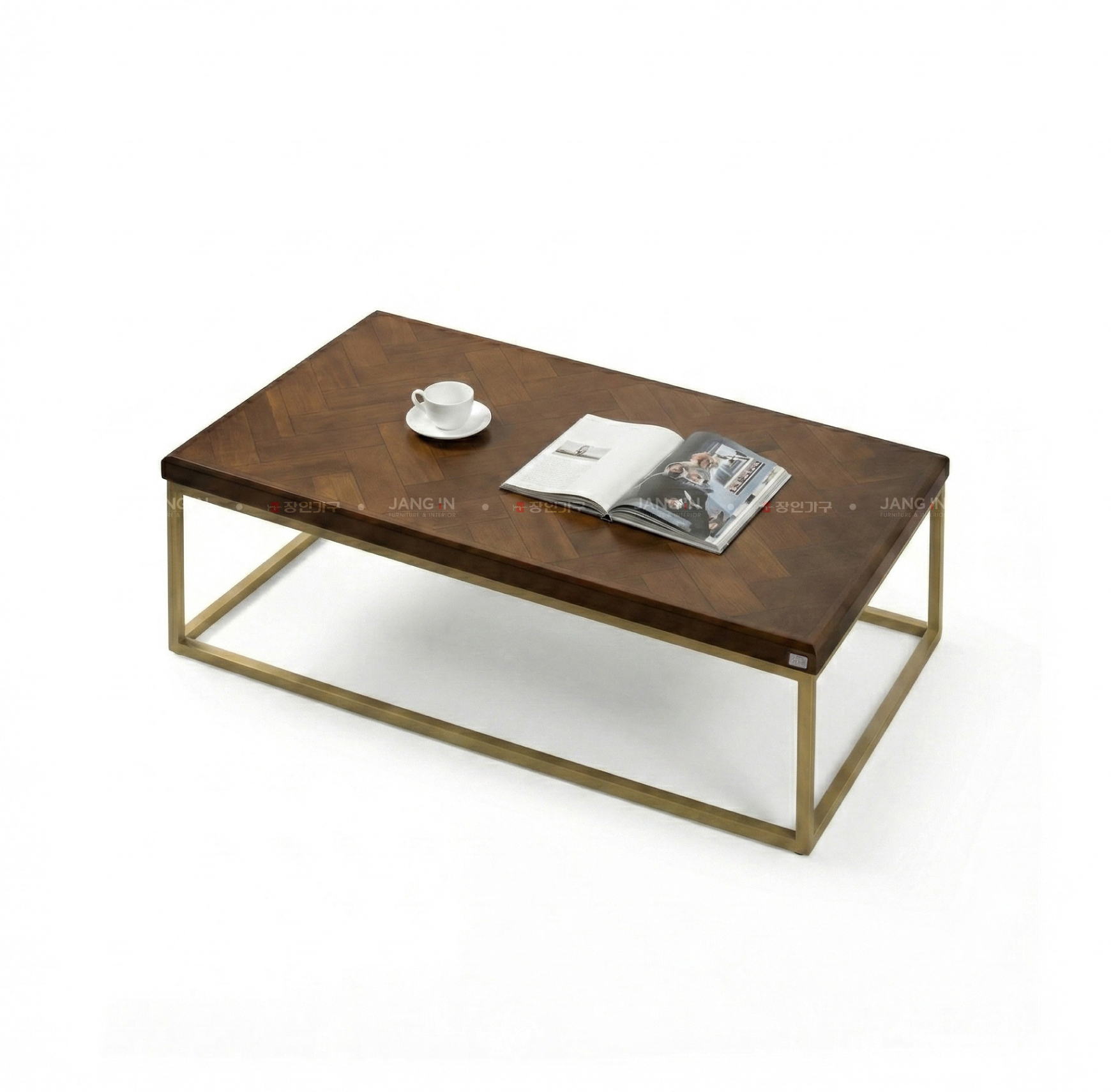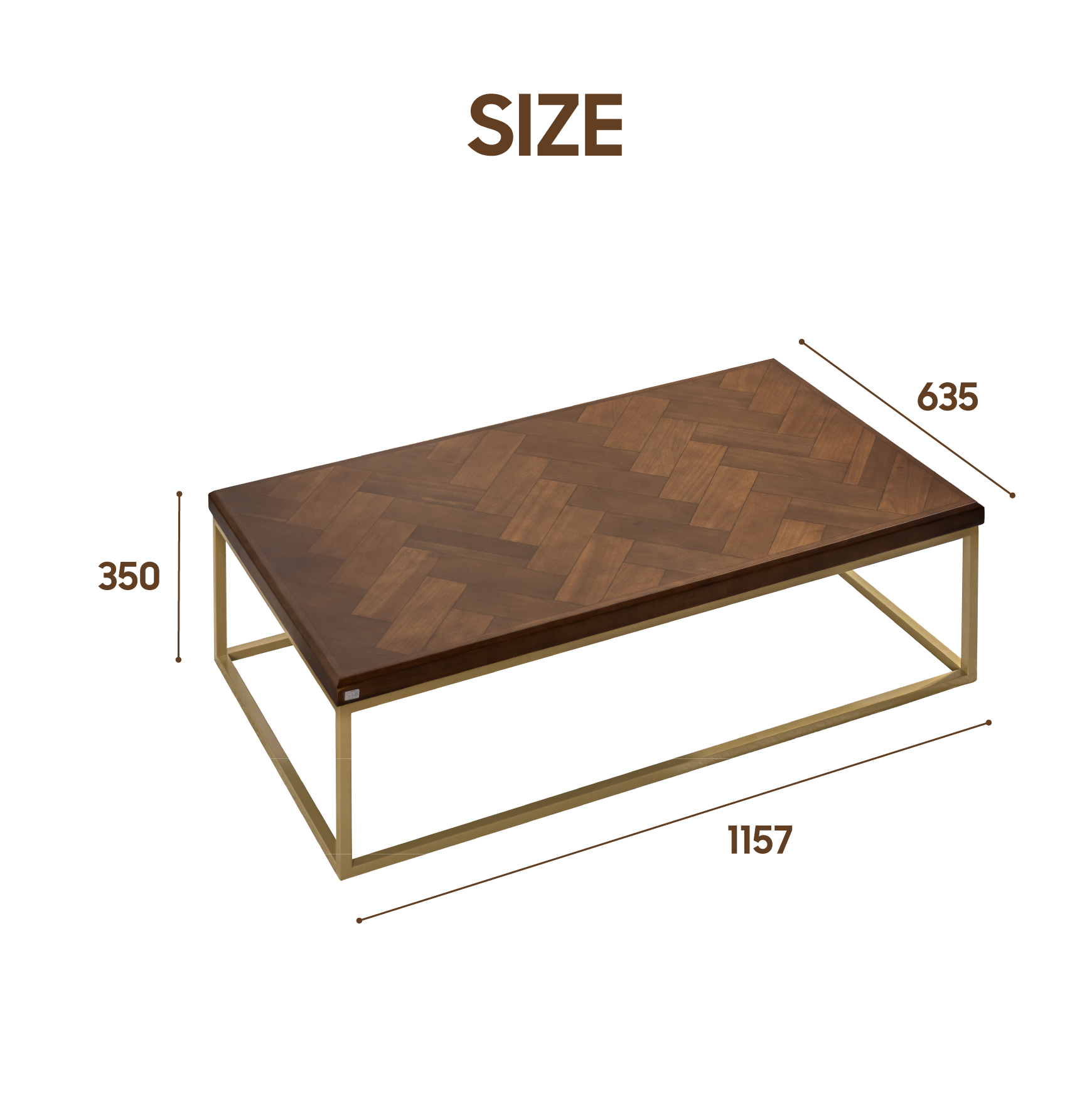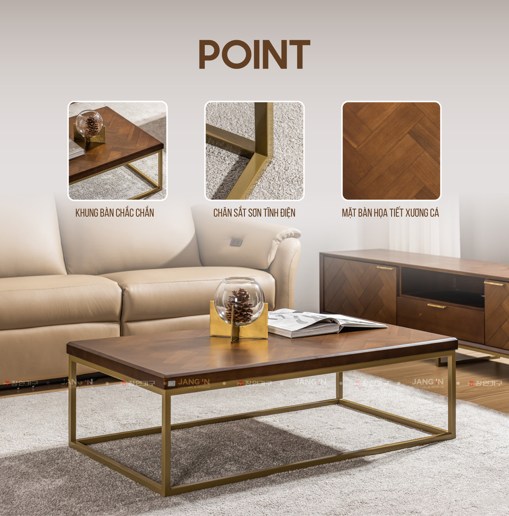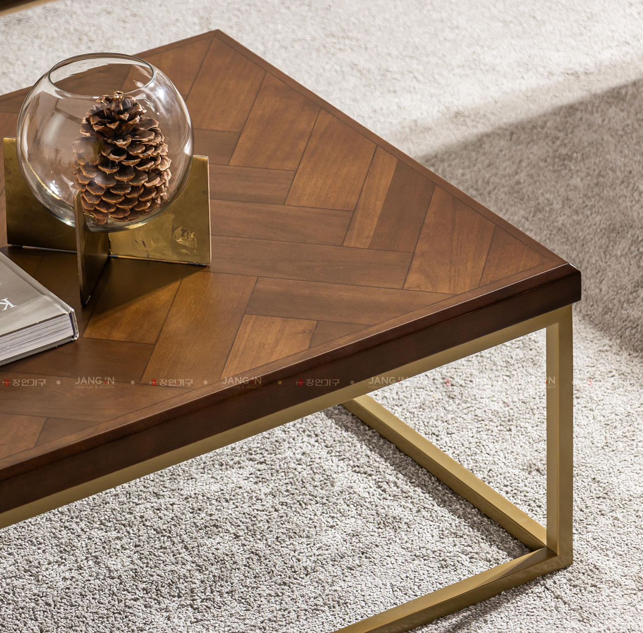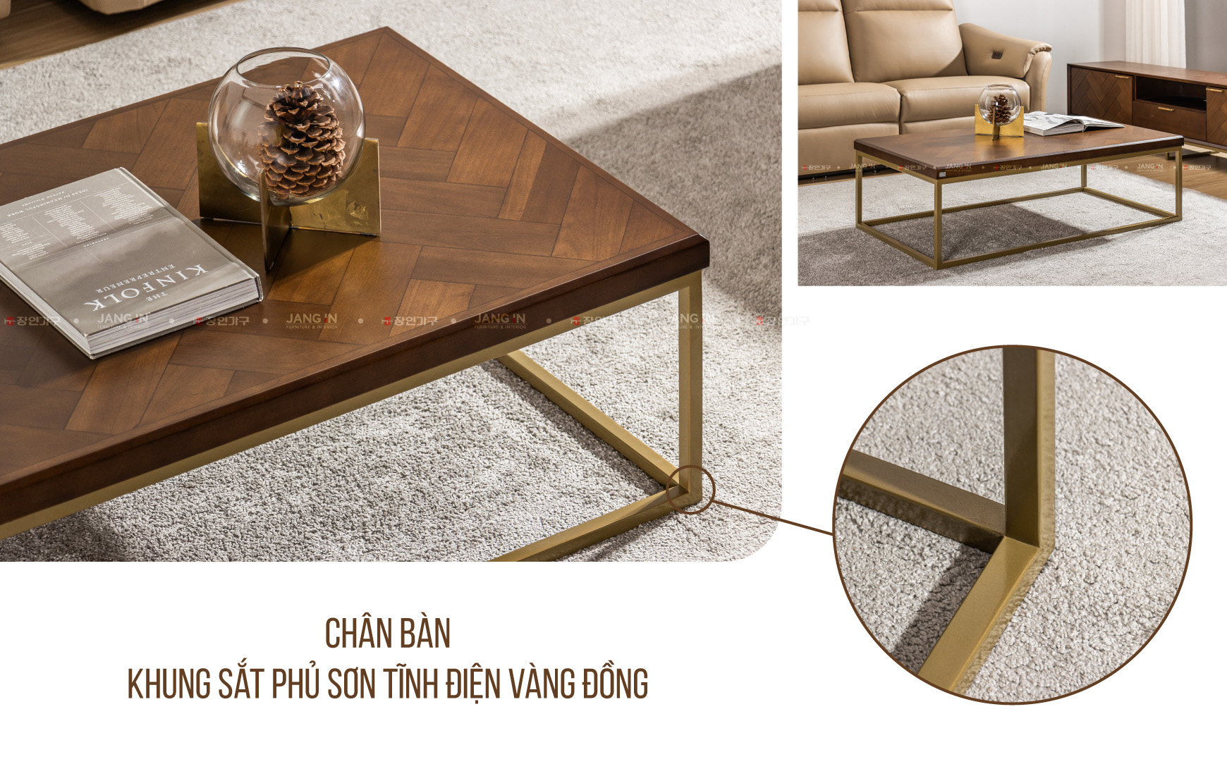 Bàn trà Bliss mang đến vẻ đẹp hiện đại với thiết kế viền ngoài từ gỗ bạch dương tự nhiên, kết hợp cùng mặt bàn phủ Veneer cao cấp. Điểm nhấn đặc biệt của sản phẩm là họa tiết xương cá được cách điệu tinh tế trên mặt bàn, không chỉ tạo nên sự độc đáo mà còn làm nổi bật không gian phòng khách, thể hiện gu thẩm mỹ riêng của gia chủ. Khung chân sắt sơn màu đồng, vừa vững chãi lại sang trọng.