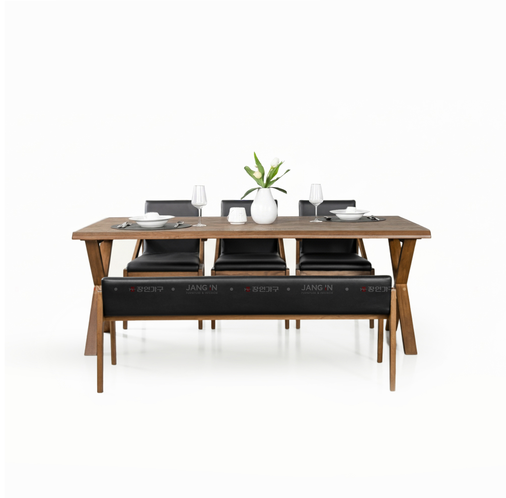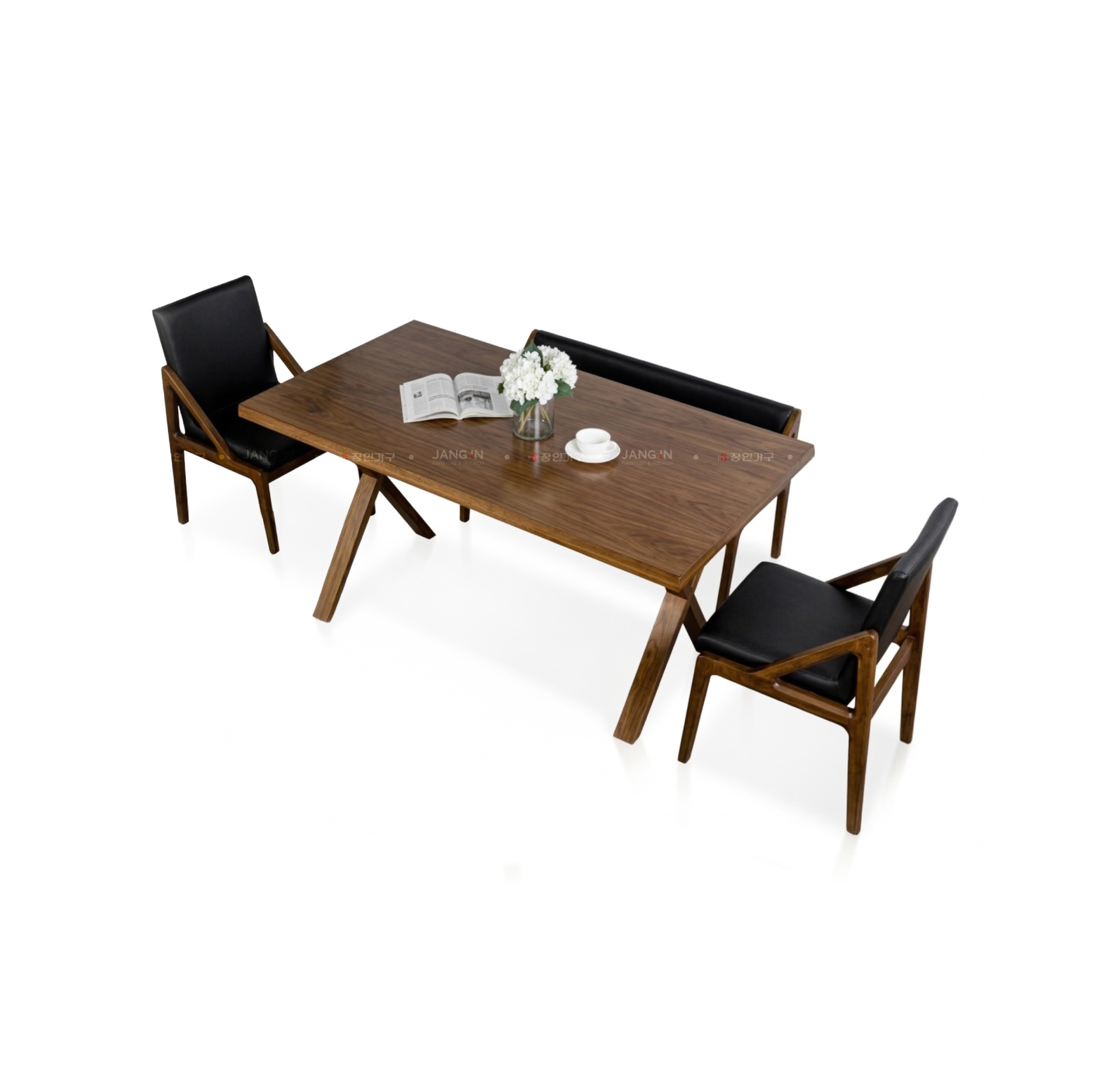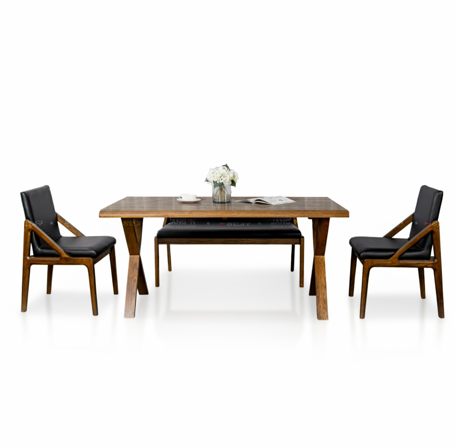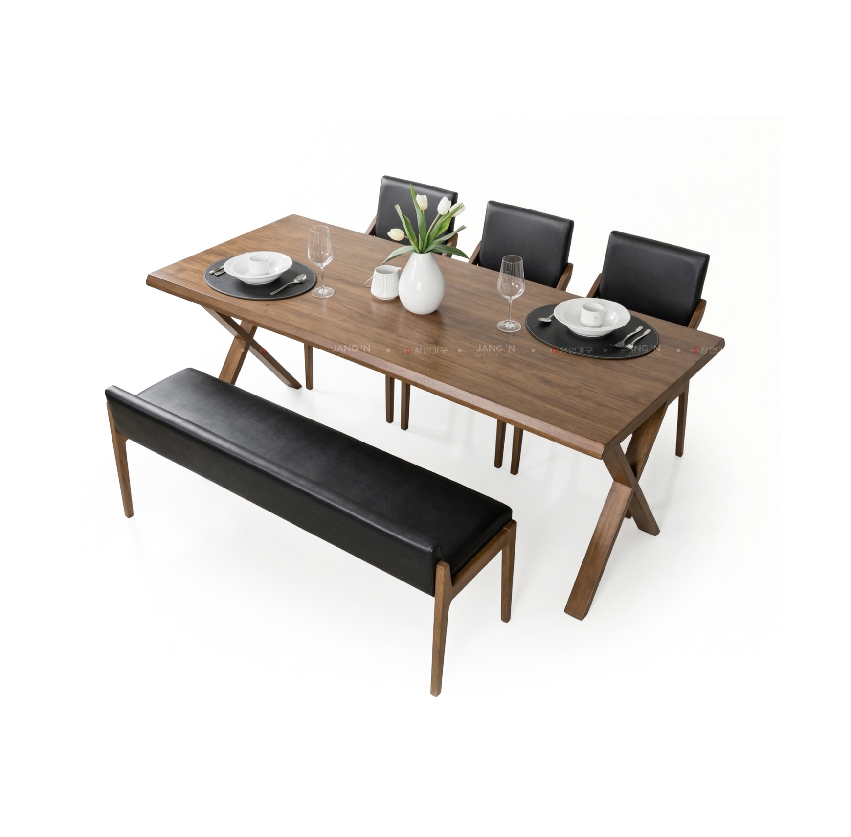 Bộ sản phẩm đi kèm ghế băng dài và ghế đơn bọc PVC cao cấp, vừa tiện lợi, dễ vệ sinh, vừa tạo nên sự linh hoạt trong bố trí. Thiết kế chân bàn chữ X độc đáo không chỉ tăng độ ổn định mà còn mang lại cảm giác mở rộng và thoáng đãng cho phòng ăn.