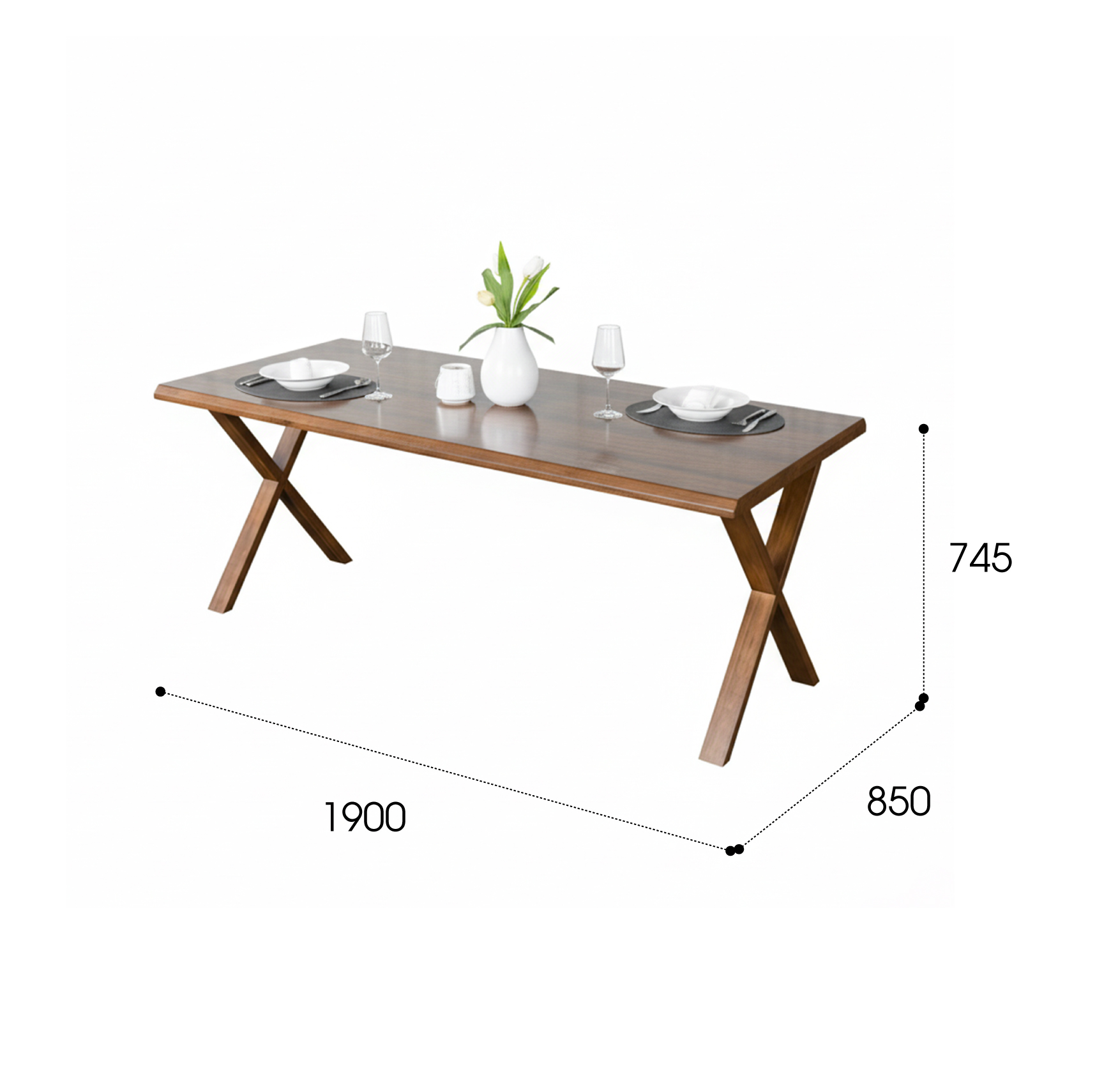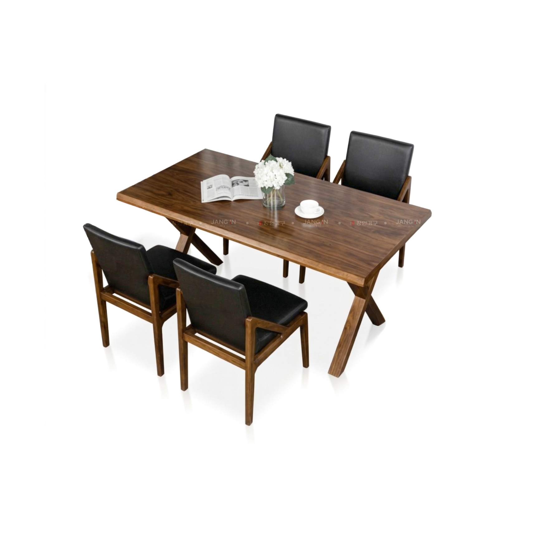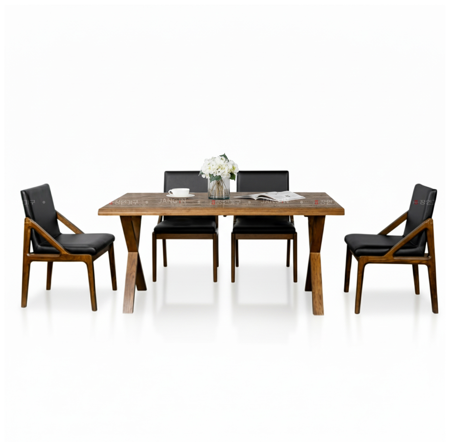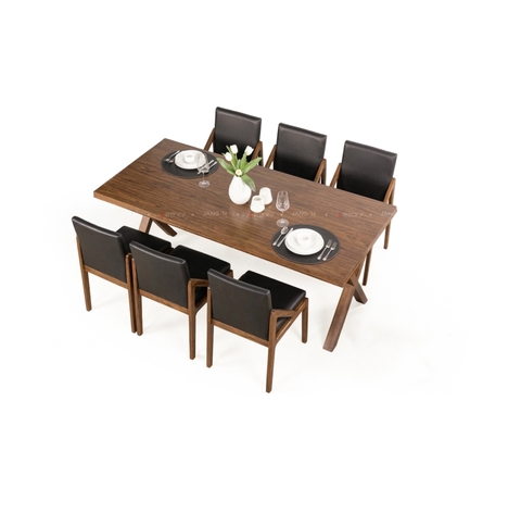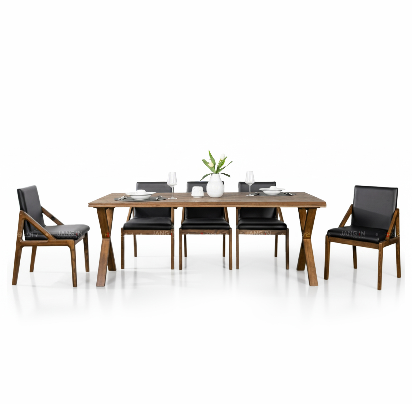 Bộ sản phẩm đi kèm ghế băng dài và ghế đơn bọc PVC cao cấp, vừa tiện lợi, dễ vệ sinh, vừa tạo nên sự linh hoạt trong bố trí. Thiết kế chân bàn chữ X độc đáo không chỉ tăng độ ổn định mà còn mang lại cảm giác mở rộng và thoáng đãng cho phòng ăn.