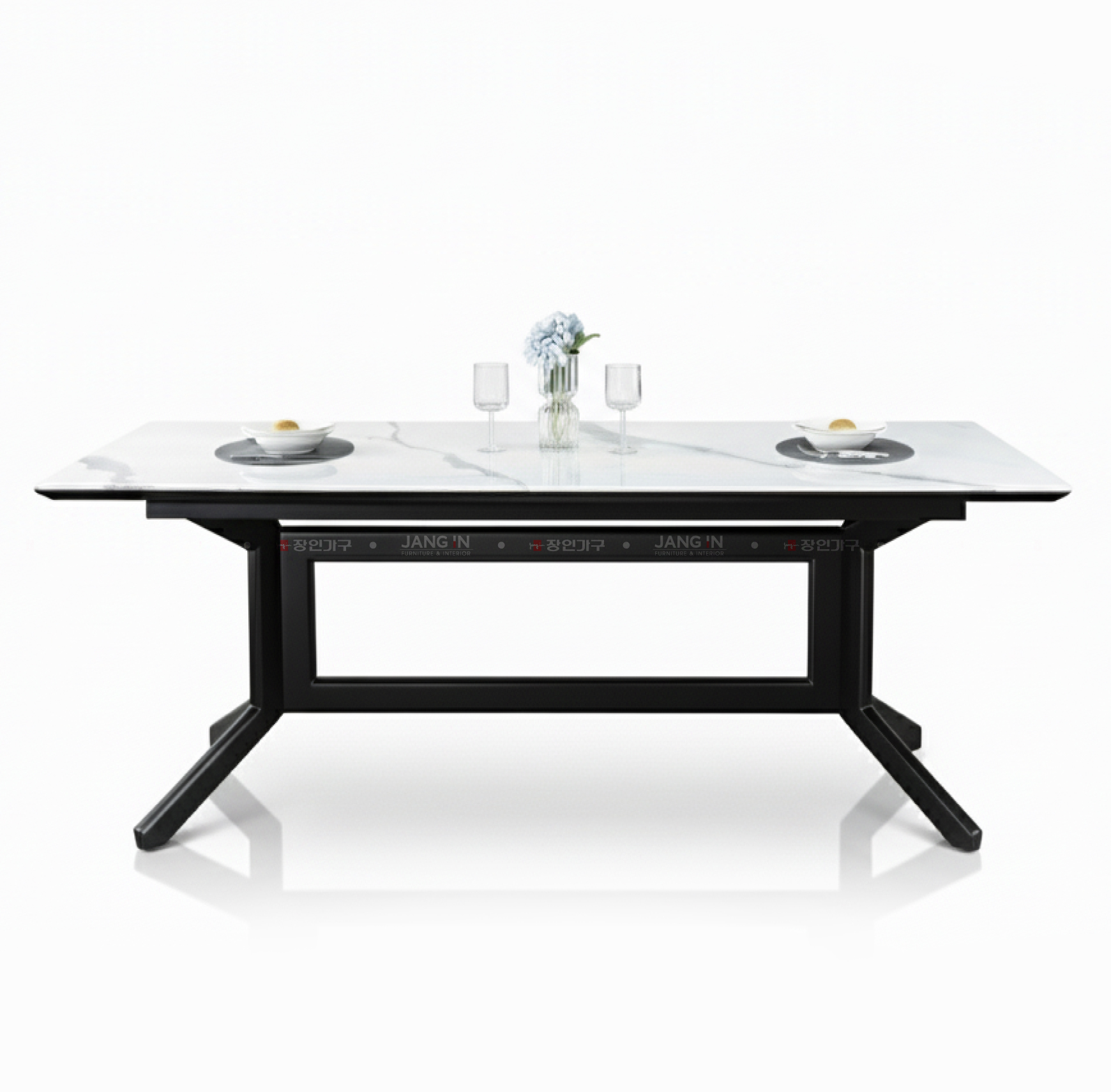 Phần chân bàn chữ X được thiết kế theo phong cách tối giản – hiện đại, tạo sự vững chắc đồng thời giữ cho tổng thể bàn ăn luôn gọn gàng.