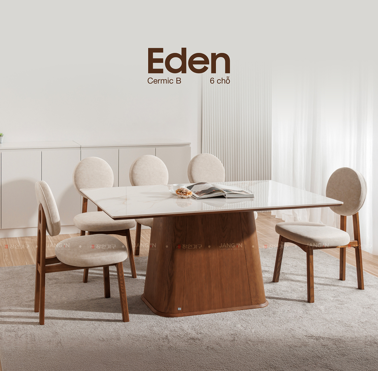 Không chỉ đáp ứng công năng sử dụng, bàn ăn Eden còn góp phần tạo nên không gian phòng ăn ấm cúng, tiện nghi nhưng vẫn sang trọng và hiện đại - nơi gắt kết những bữa ăn trọn vẹn cho gia đình.