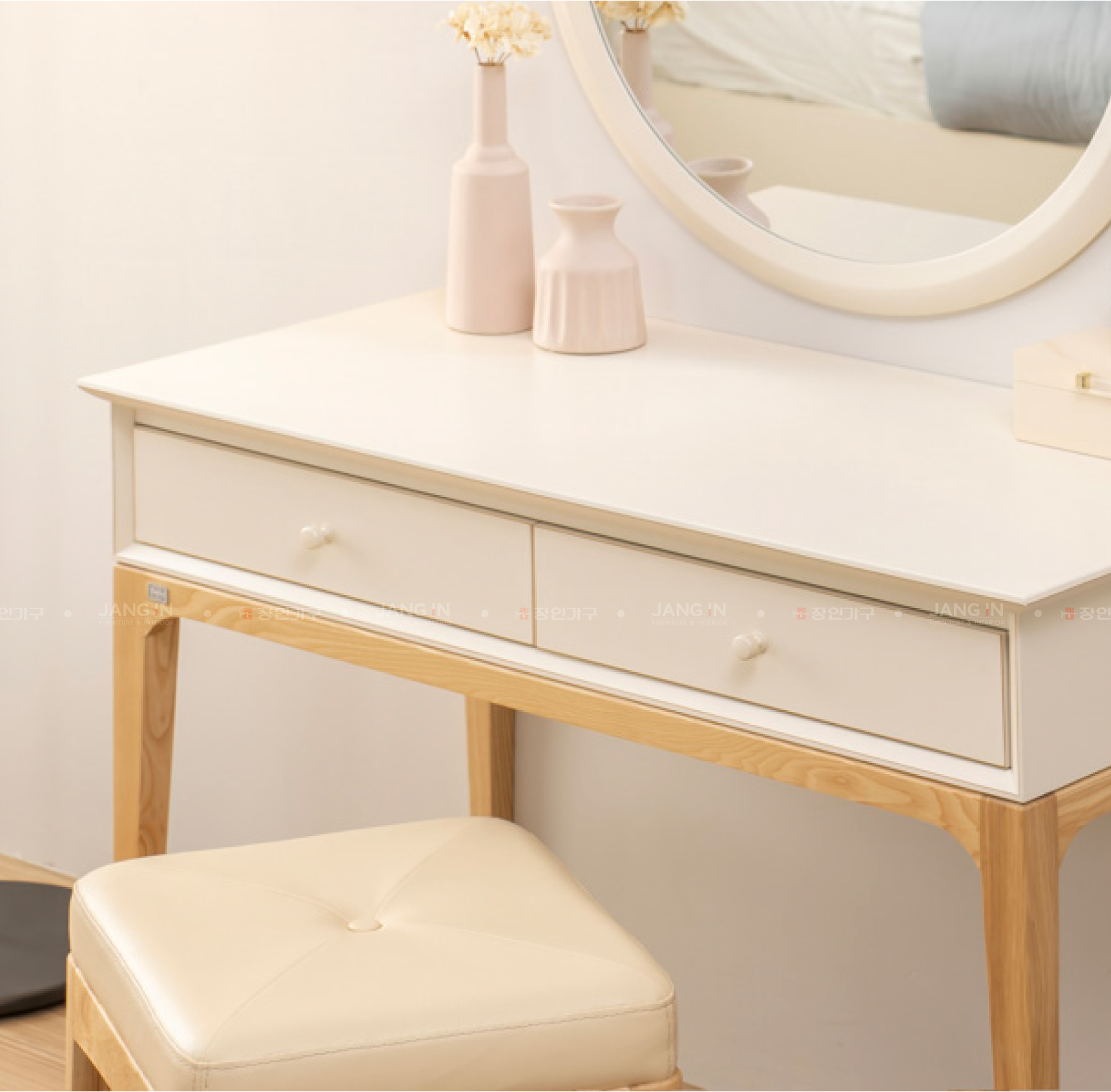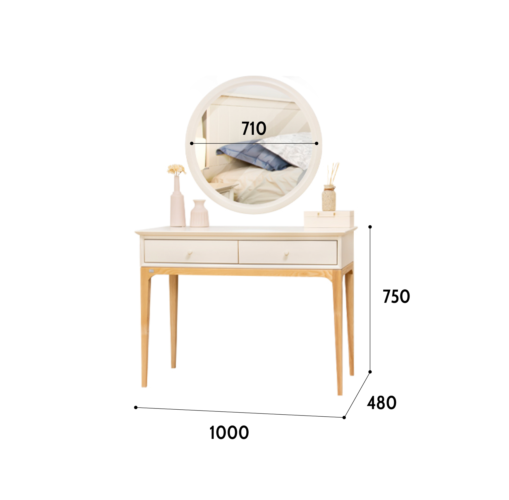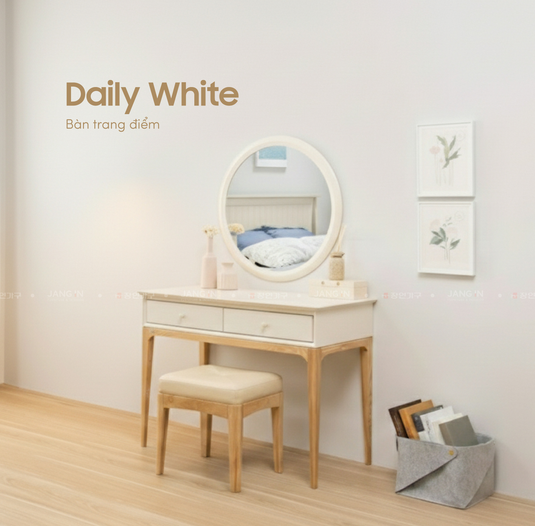 Bàn trang điểm Daily White kết hợp cùng gương tròn được chế tác từ gỗ cao su màu trắng ngà, hài hòa với chân gỗ tần bì tự nhiên chắc chắn và bền bỉ. Sự phối hợp tinh tế giữa màu sắc nhẹ nhàng và đường nét thiết kế trang nhã mang đến cảm giác thanh lịch, hiện đại. Sản phẩm không chỉ đáp ứng nhu cầu sử dụng hằng ngày mà còn góp phần tạo điểm nhấn thẩm mỹ, giúp không gian phòng ngủ trở nên tinh tế và cuốn hút hơn.