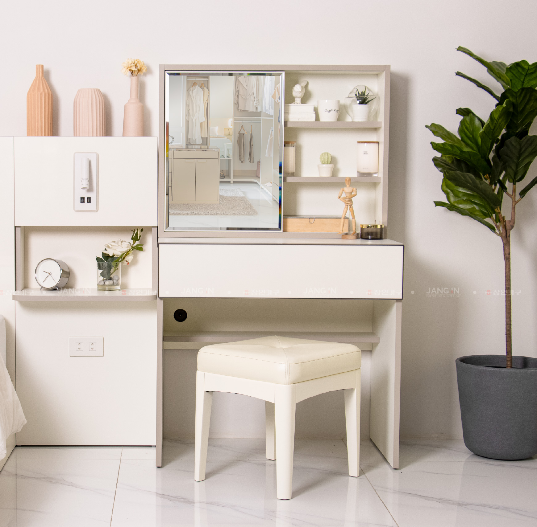 Thiết kế hiện đại, sang trọng với tông màu sáng. Ván gỗ nhập khẩu Hàn Quốc, lắp ráp tại Việt Nam. Bộ bàn trang điểm Excel là điểm nhấn tinh tế cho không gian phòng ngủ.