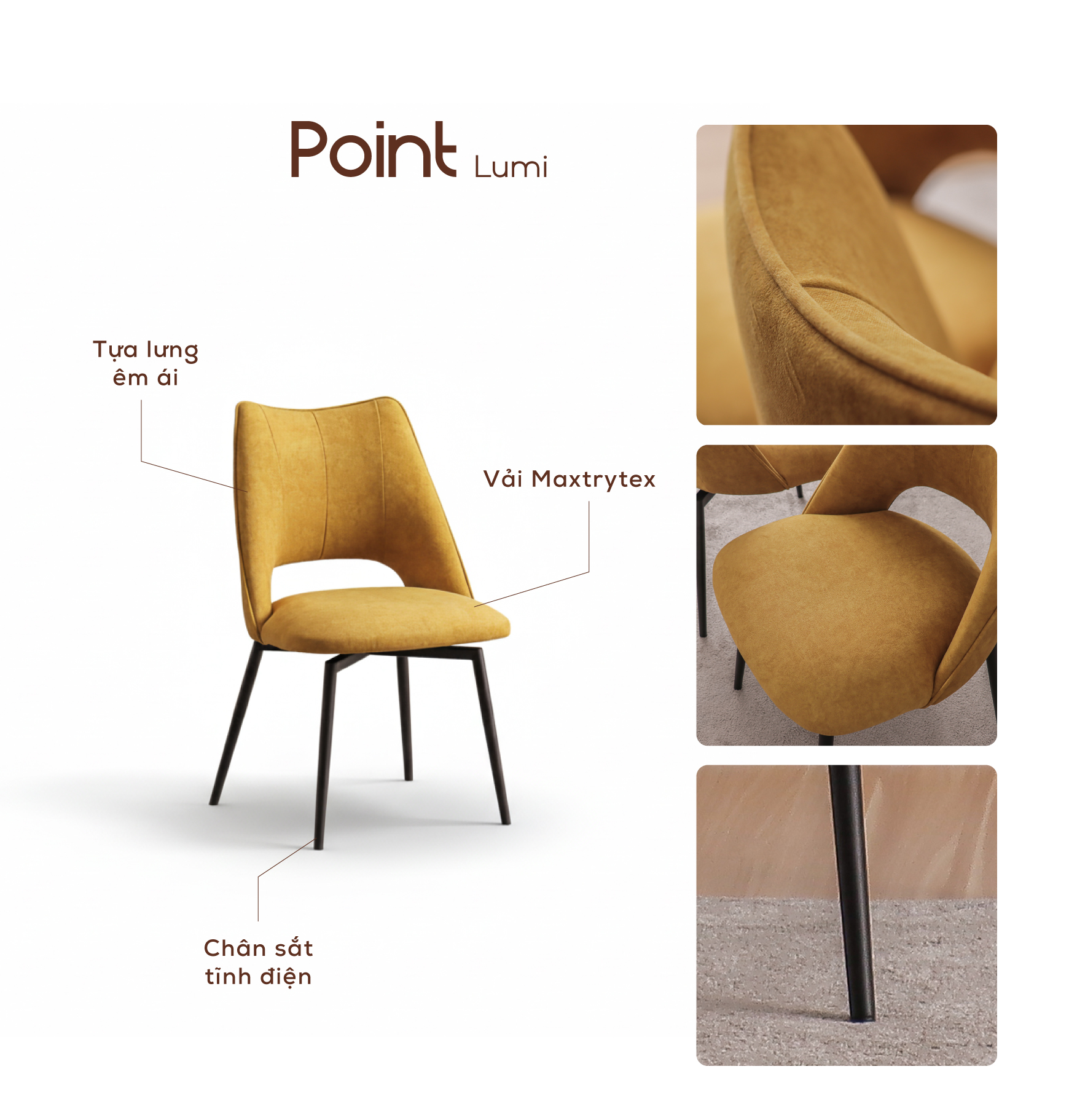 Ghế ăn Lumi sở hữu thiết kế hiện đại, nổi bật với đường cong duyên dáng ở phía trên tựa lưng. Vẻ đẹp tinh tế của Lumi song hành cùng sự thoải mái tuyệt vời mà nó mang lại. Sản phẩm được tạo nên từ những vật liệu cao cấp như vải Maxtrytex siêu mềm mại hoặc da Silicon thoáng mát, kết hợp cùng khung sắt sơn tĩnh điện bền bỉ. Hai gam màu Brown và Gold thời thượng hứa hẹn kiến tạo nên không gian phòng ăn sang trọng.