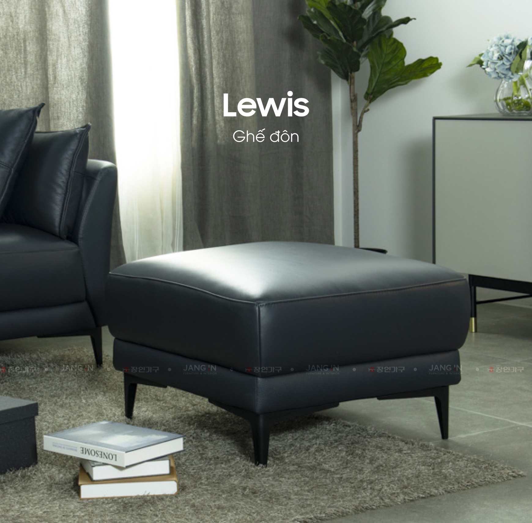 Ghế đôn sofa Lewis sản xuất từ loại da cao cấp thương hiệu Ý, thiết kế tinh tế kết hợp màu Navy mạnh mẽ mang đến sự sang trọng và hiện đại cho phòng khách.