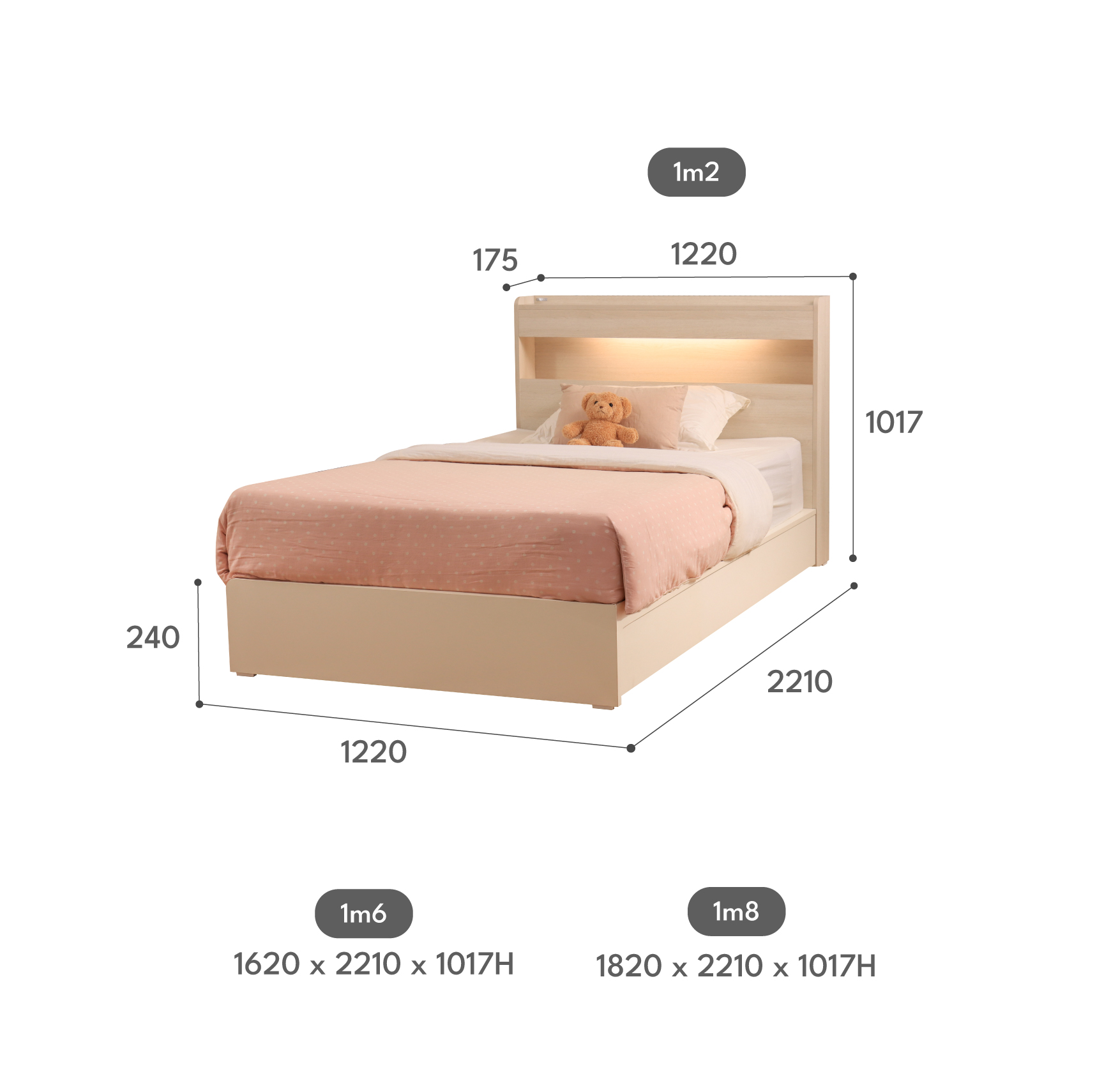 Giường 1m8: 1820*2210*1017H |