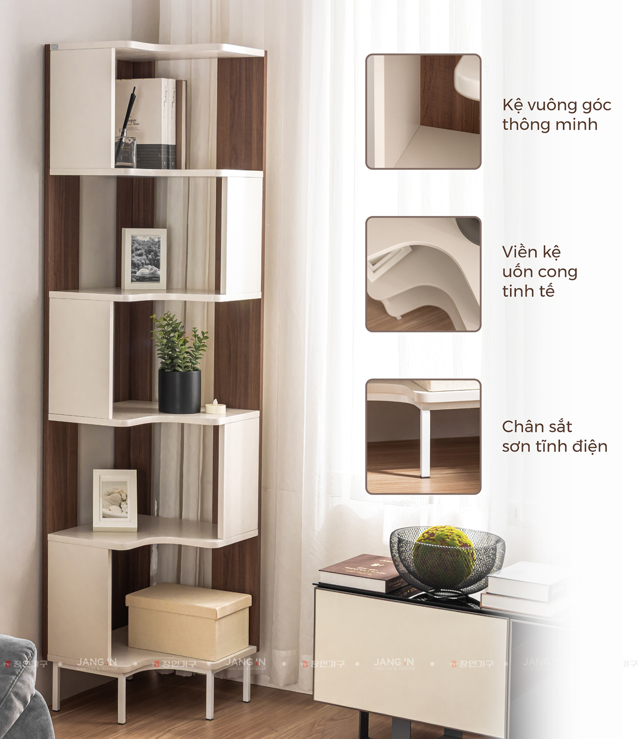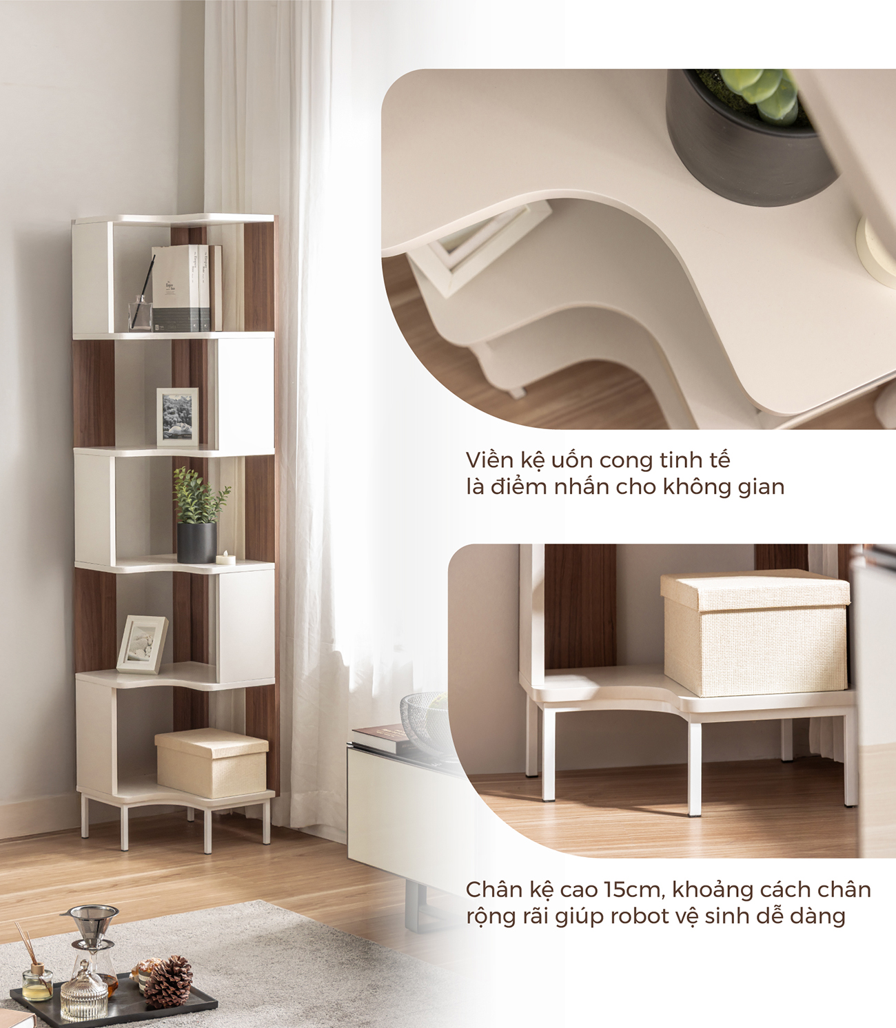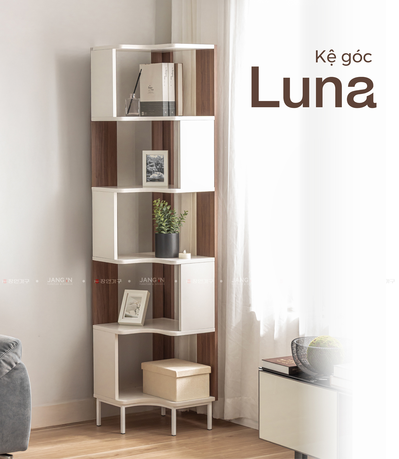 Kệ góc Luna - sản phẩm nội thất được thiết kế theo phong cách hiện đại, kết hợp màu trắng và màu gỗ nâu trang nhã. Với cấu trúc 5 tầng kệ và thiết kế vuông góc thông minh, sản phẩm tận dụng hiệu quả các góc tường, giúp lưu trữ và trang trí một cách tinh tế.