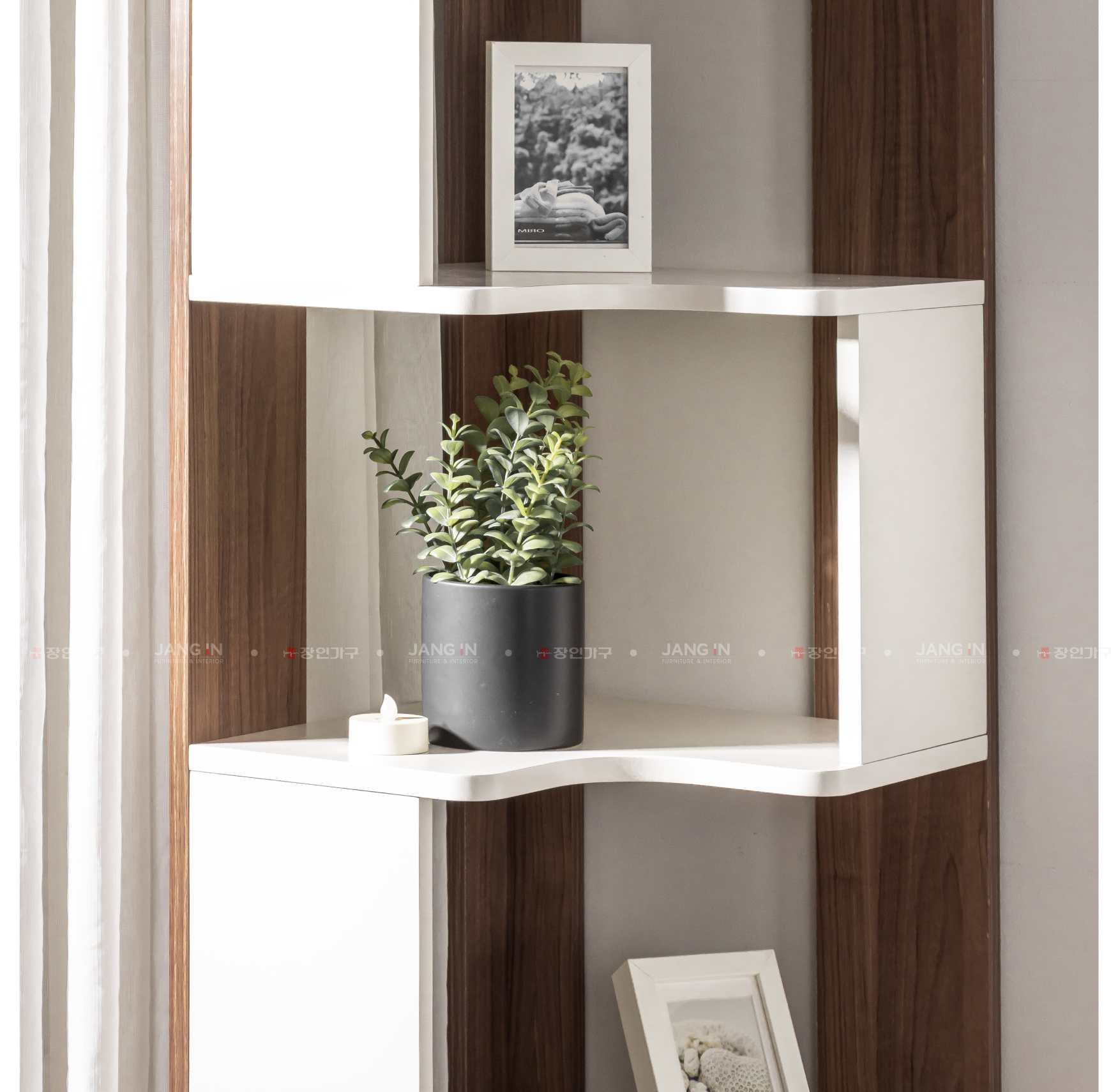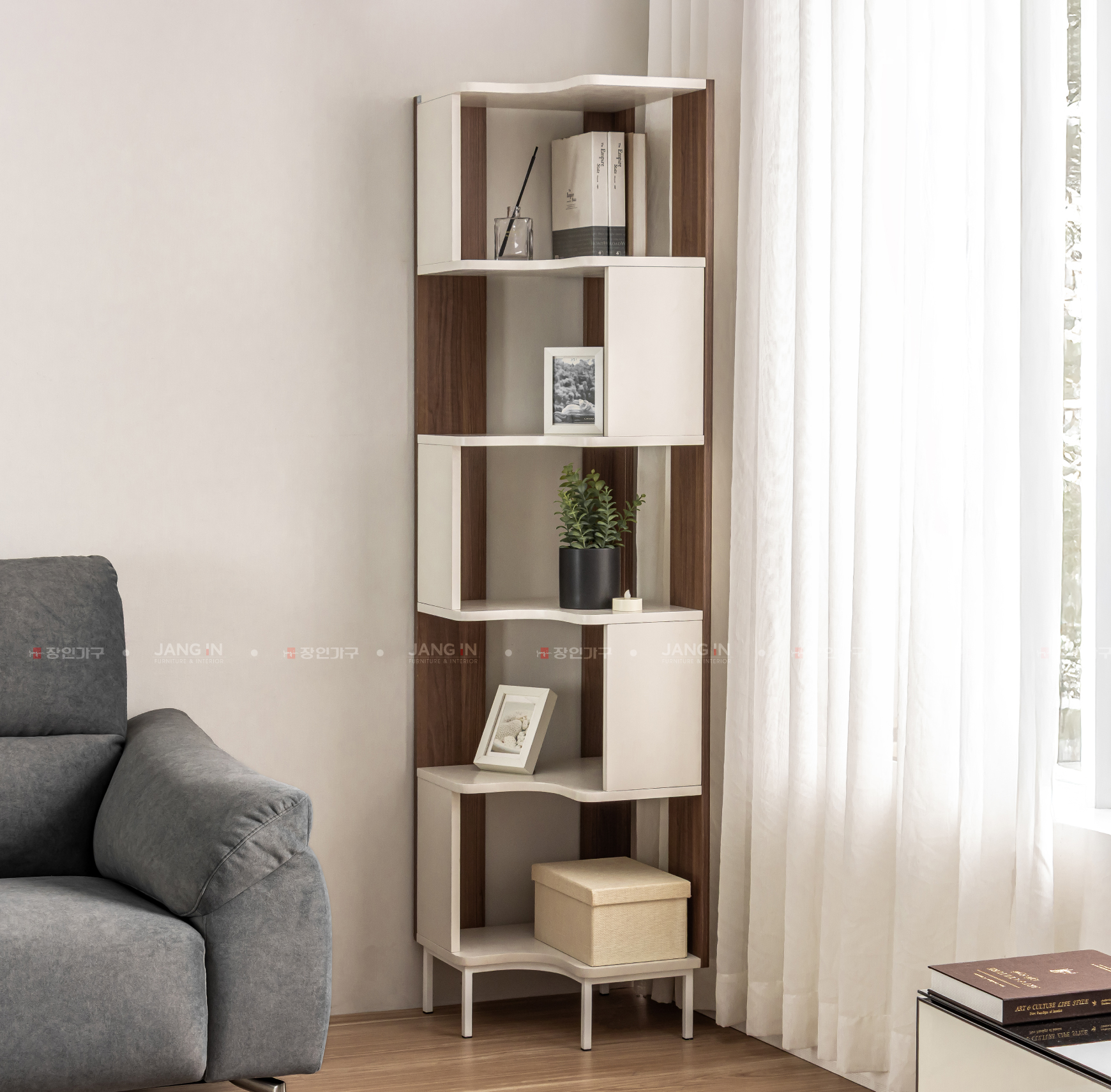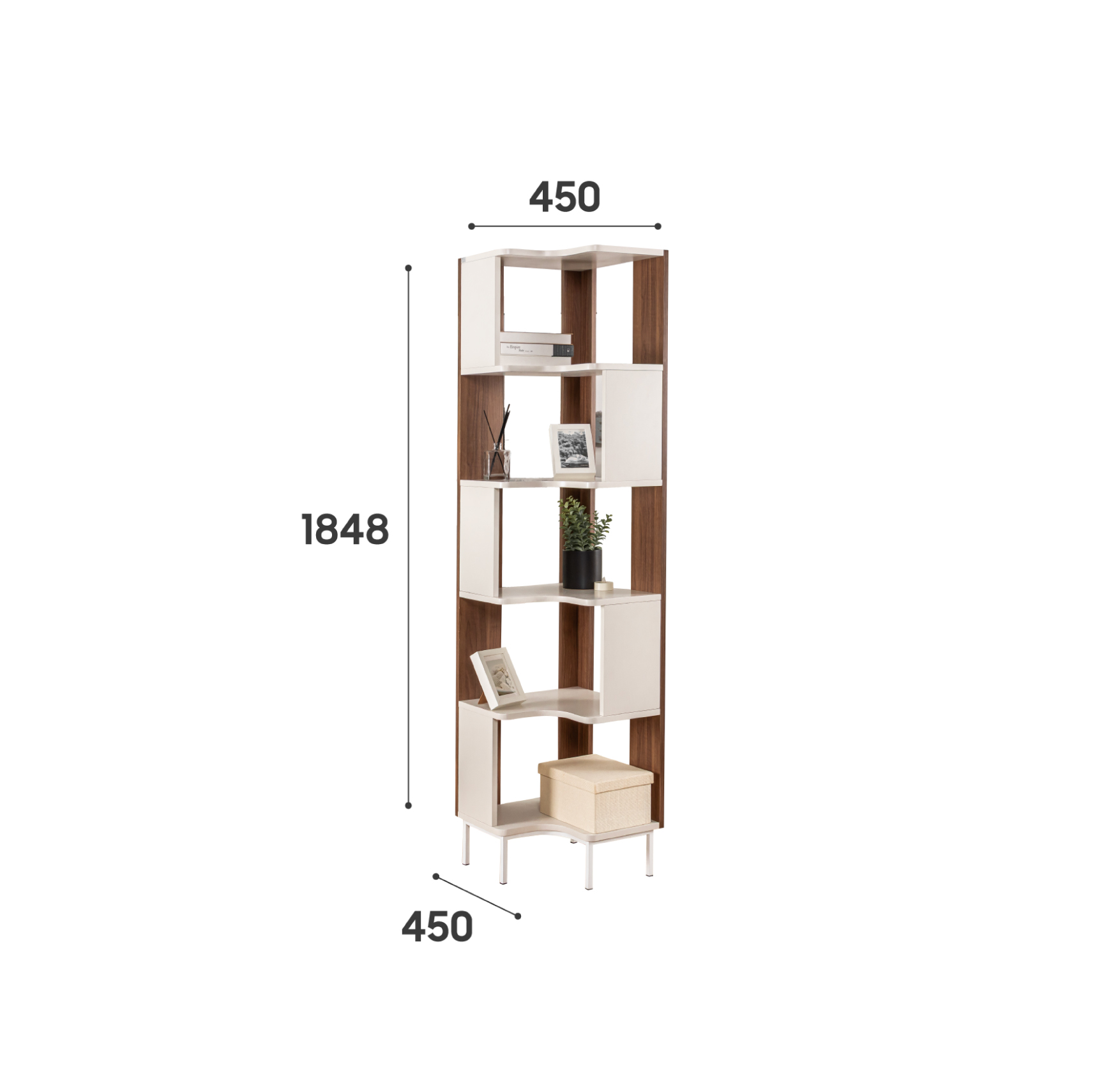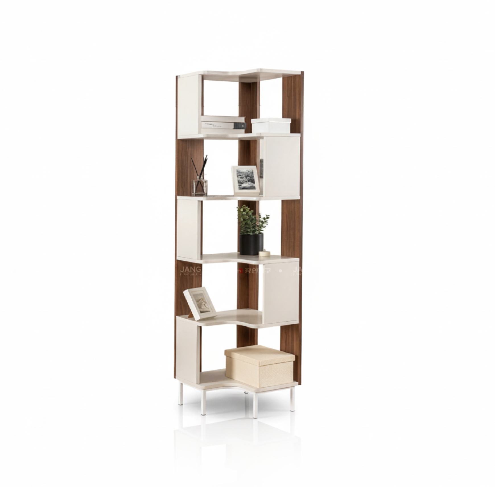 Kệ góc Luna - sản phẩm nội thất được thiết kế theo phong cách hiện đại, kết hợp màu trắng và màu gỗ nâu trang nhã. Với cấu trúc 5 tầng kệ và thiết kế vuông góc thông minh, sản phẩm tận dụng hiệu quả các góc tường, giúp lưu trữ và trang trí một cách tinh tế.