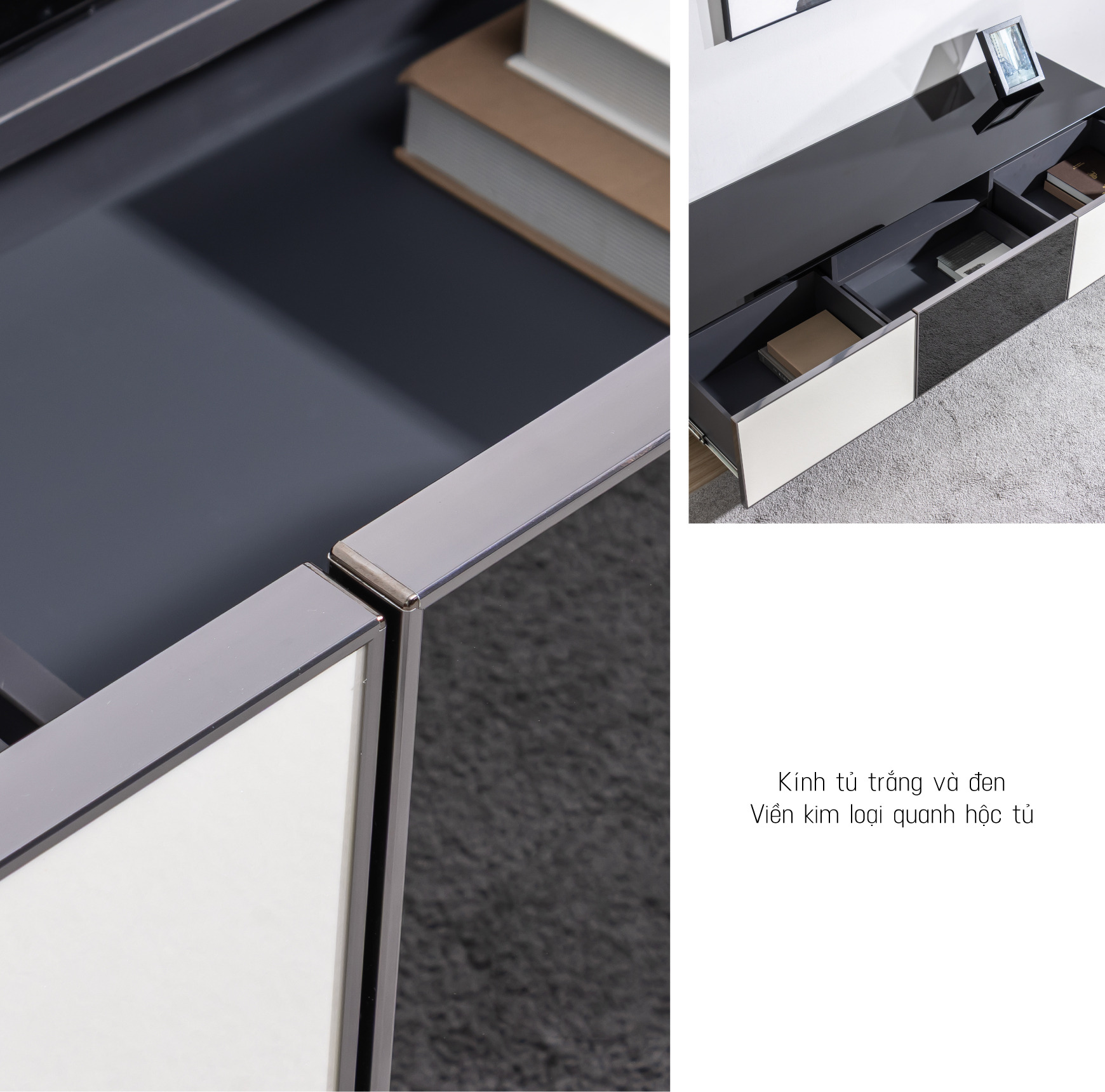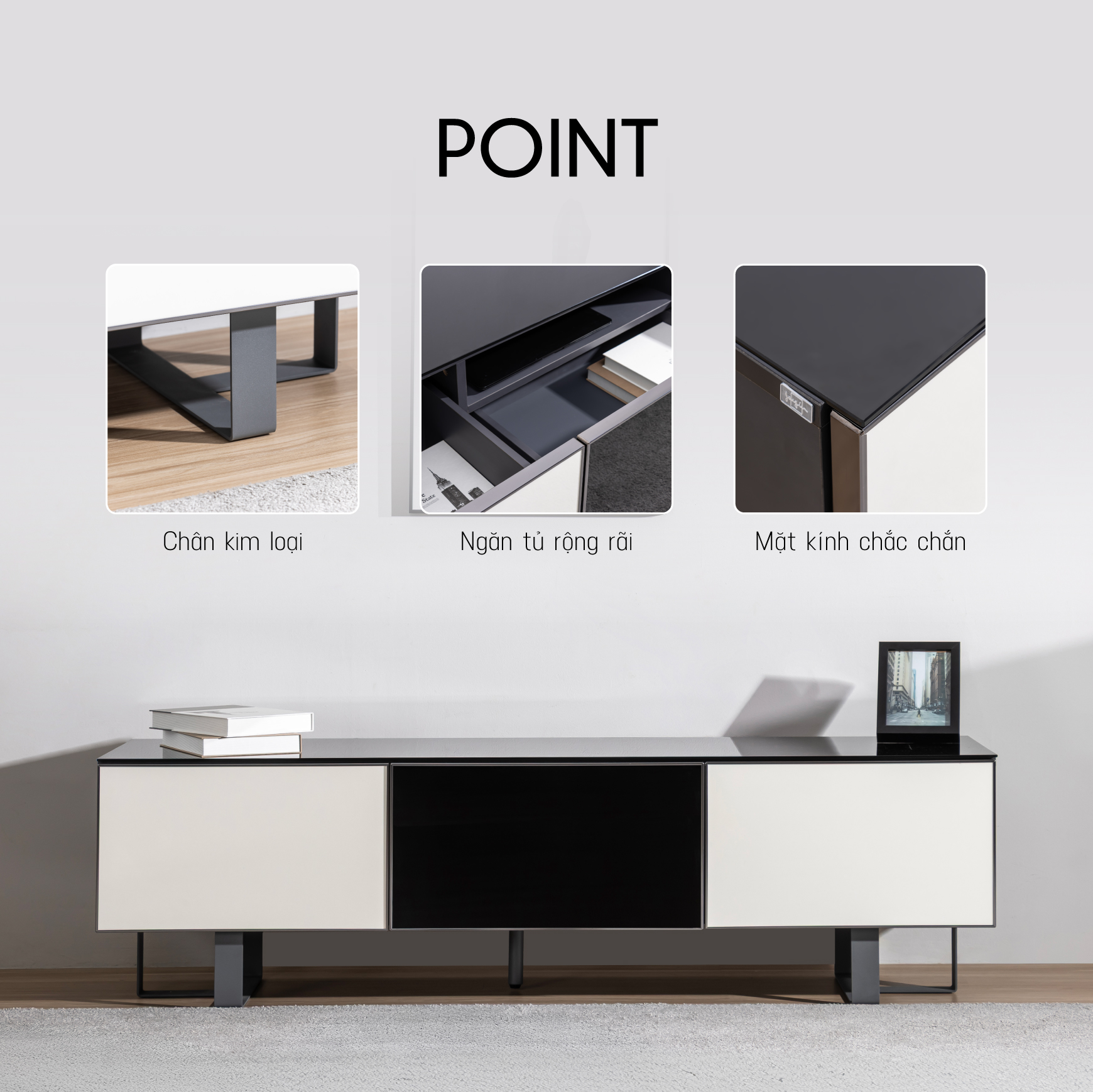 Kệ TV Concert là mẫu kệ tivi mang đậm phong cách tối giản nhưng vẫn tạo được điểm nhấn nhờ sự phối màu đen trắng nổi bật, chất liệu kính đen và viền nhôm tinh tế. Sản phẩm sở hữu kết cấu chắc chắn, vật liệu thân thiện môi trường, thiết kế nhỏ gọn phù hợp với không gian hiện đại, đặc biệt dễ dàng vệ sinh và an toàn khi sử dụng.