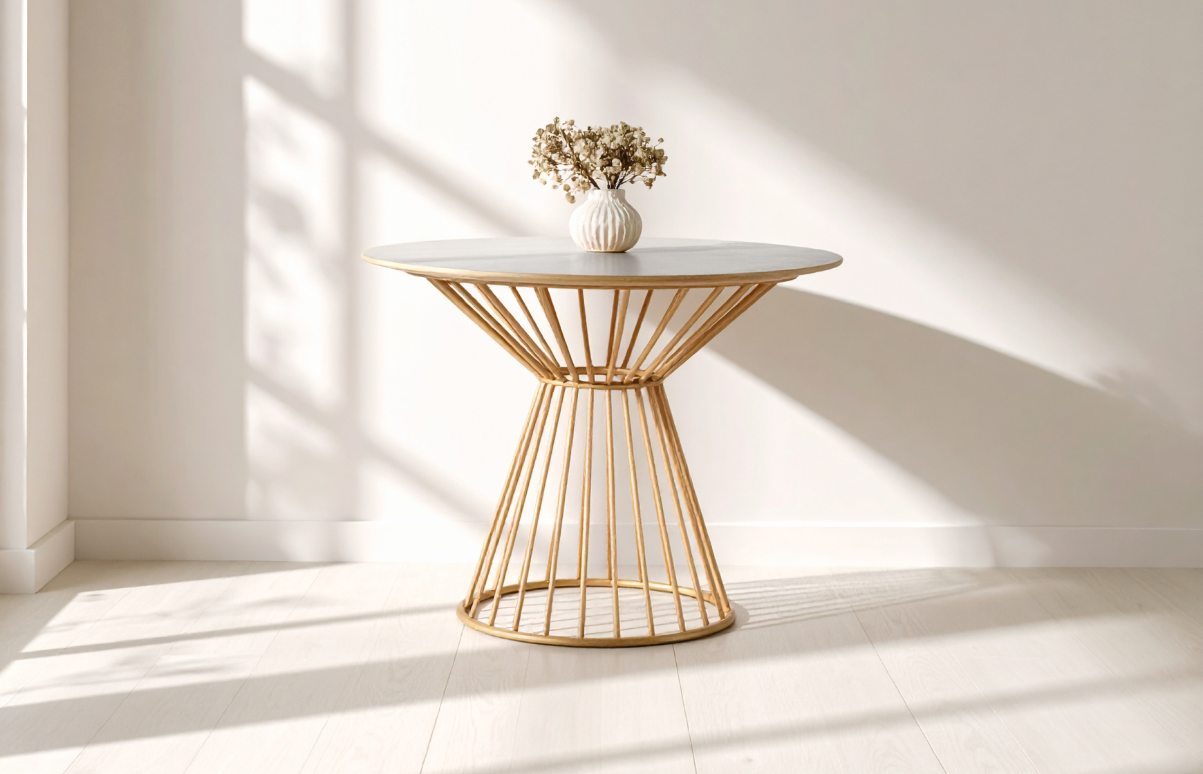 Bàn ăn tròn Georgia với mặt đá Ceramic D và chân đế bằng kim loại vàng. Thiết kế chân bàn dạng nan quạt độc đáo, tạo điểm nhấn hiện đại và thanh lịch. Sản phẩm phù hợp cho không gian phòng khách hoặc khu vực tiếp khách.