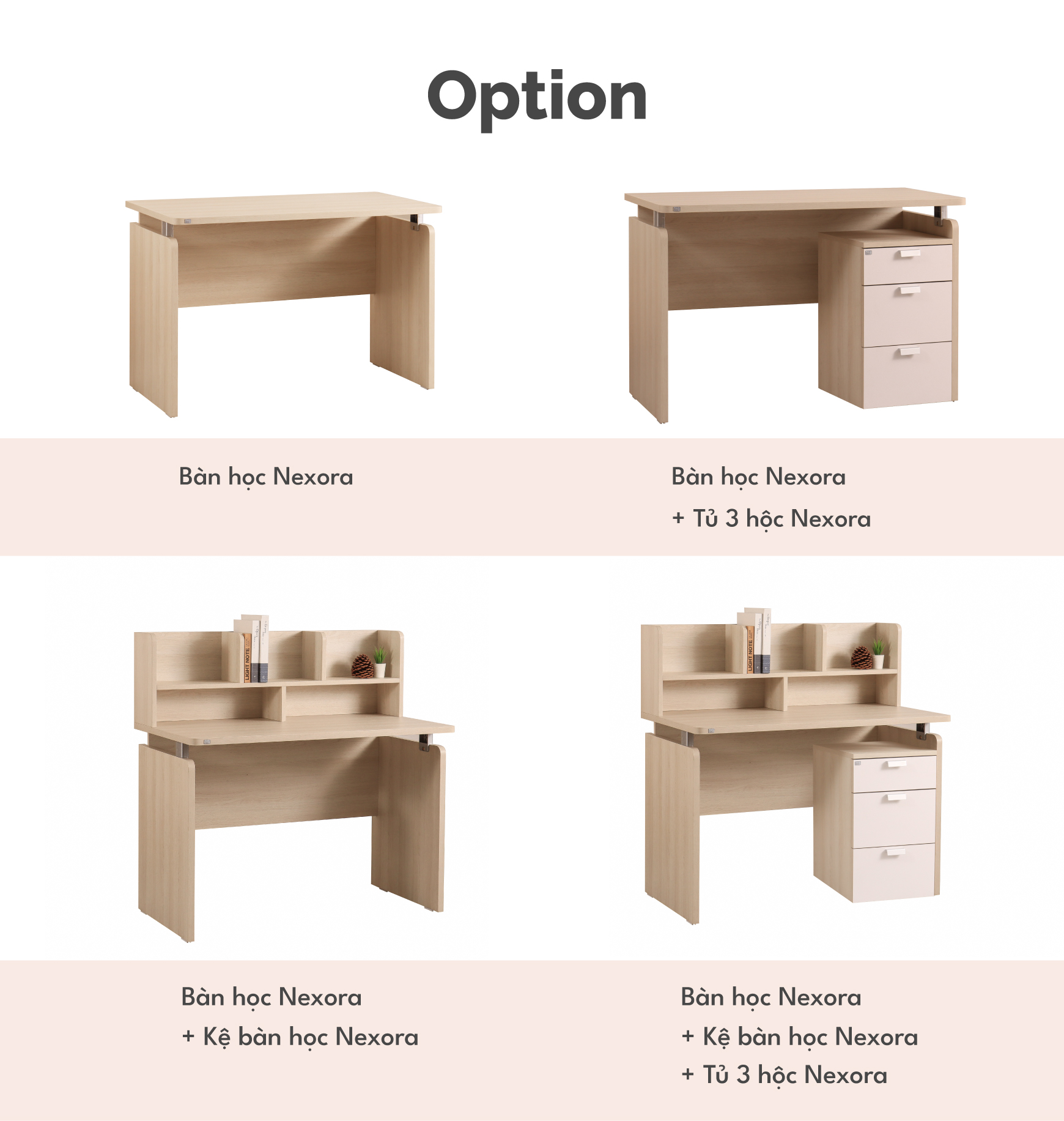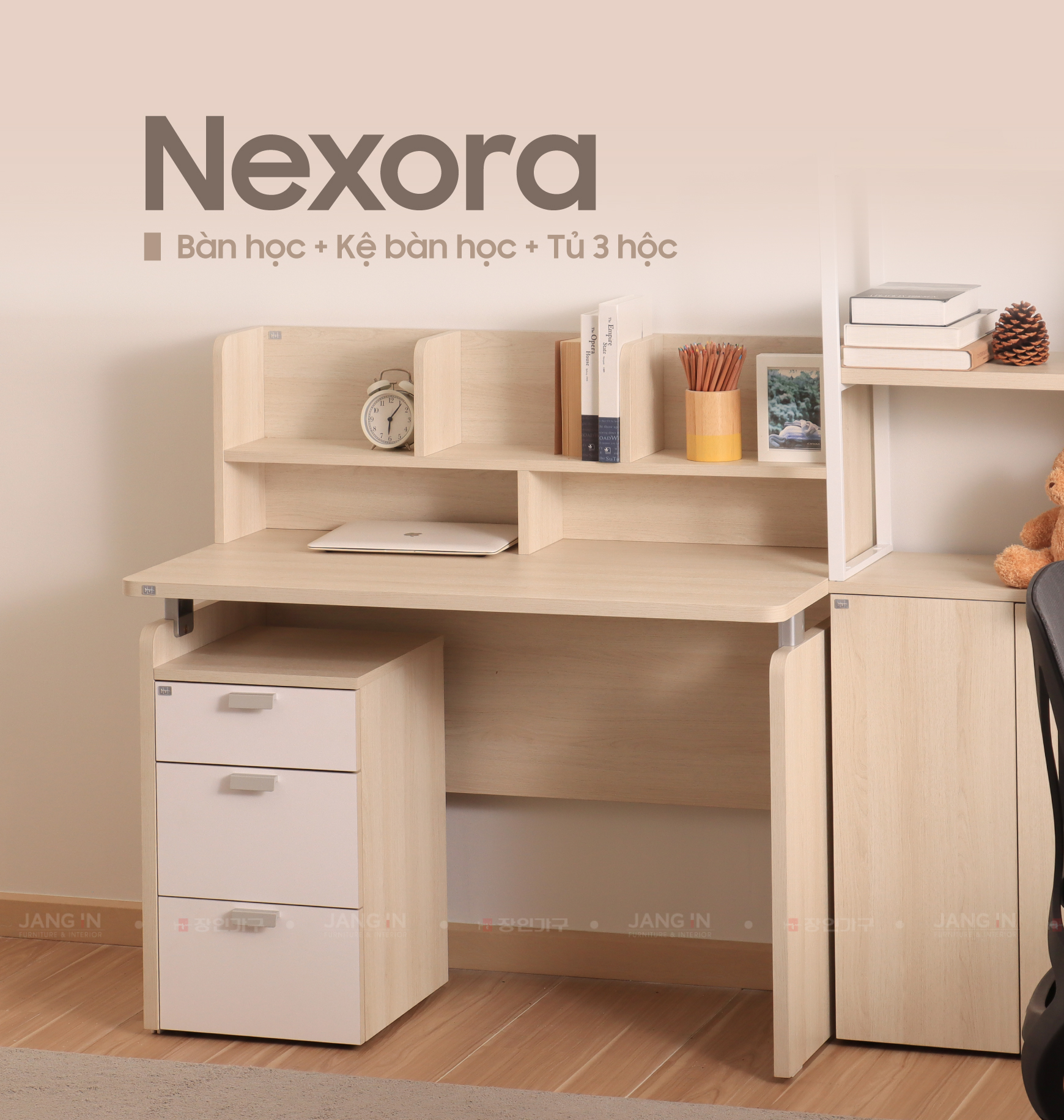 Bộ bàn học Nexora gồm bàn học, kệ bàn học và tủ 3 hộc đi kèm, là giải pháp học tập hoàn chỉnh cho trẻ. Thiết kế hiện đại với màu gỗ sáng mang lại cảm giác nhẹ nhàng, dễ phối hợp nội thất. Kệ treo giúp trưng bày sách vở, đồ dùng học tập tiện lợi; tủ 3 hộc hỗ trợ lưu trữ linh hoạt. Toàn bộ sản phẩm sử dụng chất liệu thân thiện, đảm bảo độ bền cao, dễ vệ sinh và an toàn trong quá trình sử dụng.
