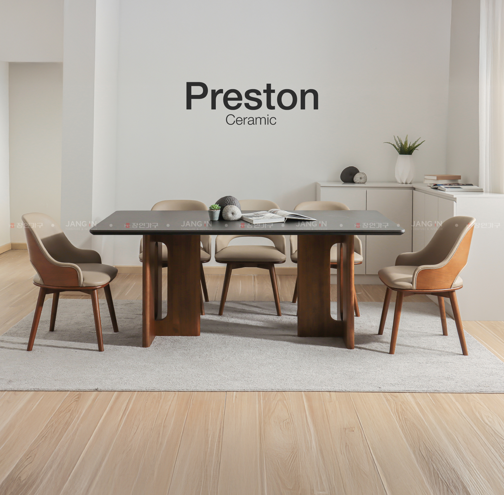 Bàn ăn Preston M là sản phẩm nội thất hiện đại với mặt bàn ceramic đen vân trắng, thiết kế tinh tế và khả năng chịu lực, chịu nhiệt cao. Sự kết hợp giữa chân bàn gỗ chữ T và ghế xoay Hugo tạo nên một tổng thể hài hòa, phù hợp với nhiều không gian sống khác nhau.