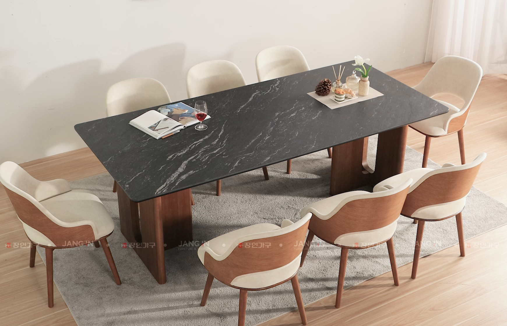 Bàn ăn Preston N là sản phẩm nội thất hiện đại với mặt bàn ceramic đen vân trắng, thiết kế tinh tế và khả năng chịu lực, chịu nhiệt cao. Sự kết hợp giữa chân bàn gỗ chữ T và ghế xoay Hugo tạo nên một tổng thể hài hòa, phù hợp với nhiều không gian sống khác nhau.