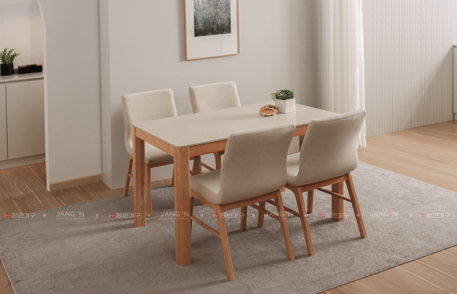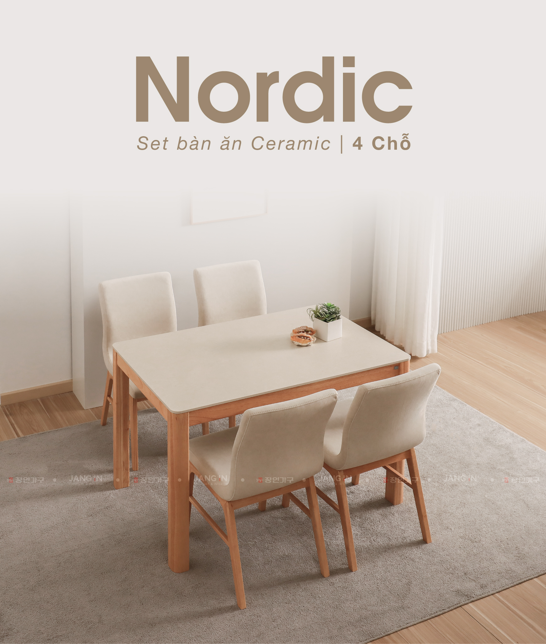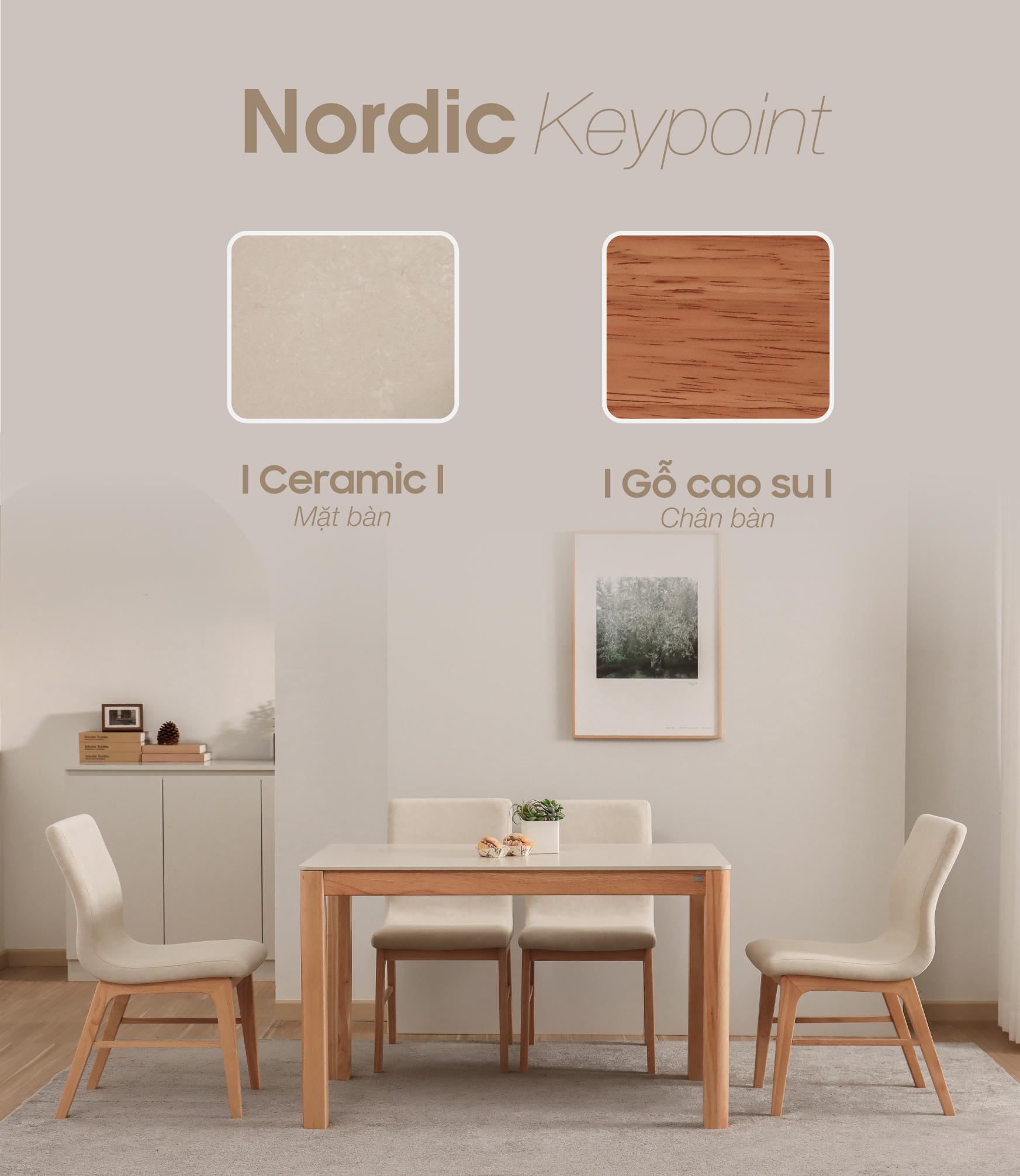 Bàn ăn Nordic 4 chỗ có mặt Ceramic Beige kết hợp khung gỗ cao su tự nhiên. Thiết kế đơn giản, dễ vệ sinh, phù hợp không gian bếp nhỏ gọn.