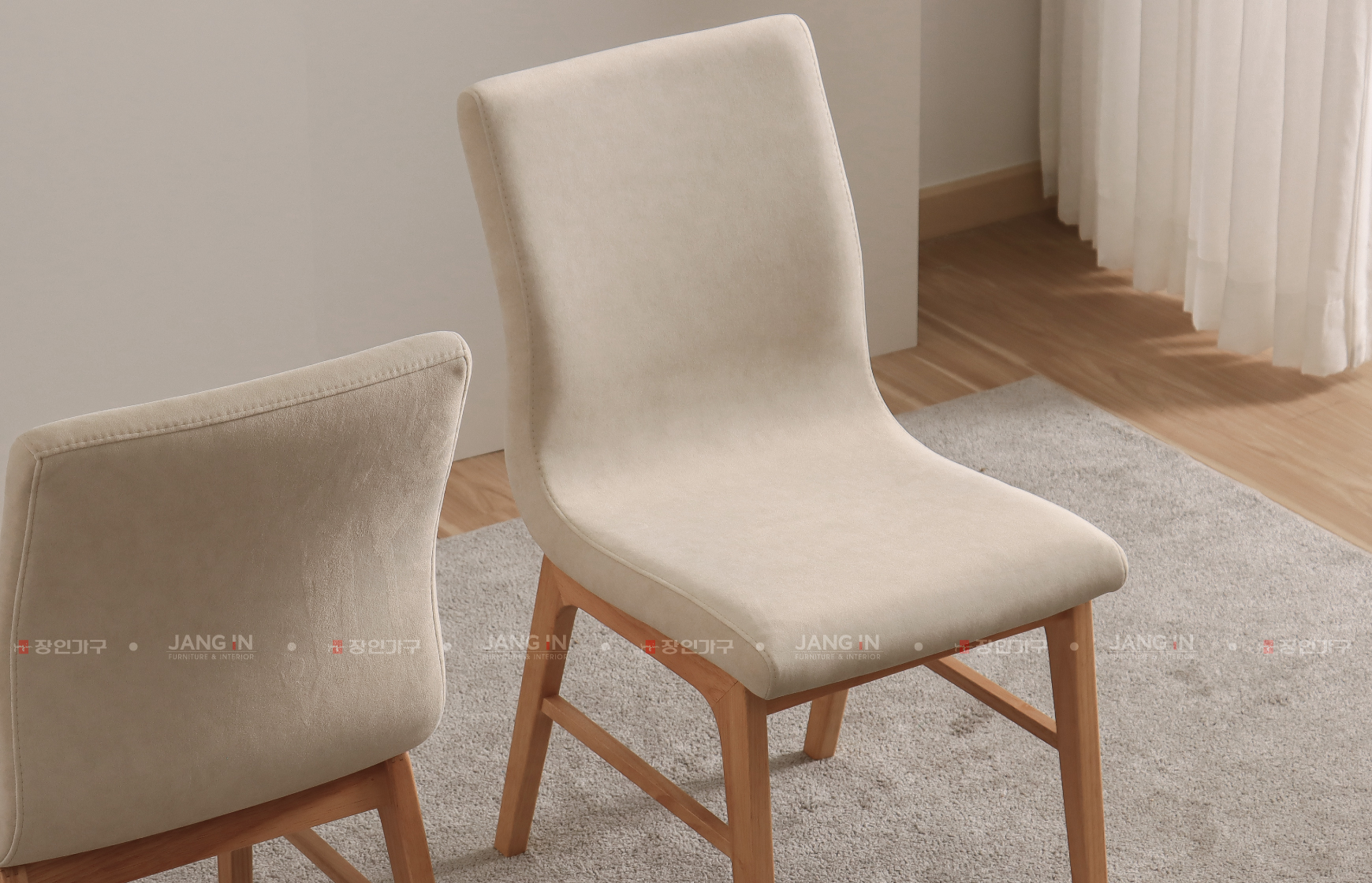 Ghế ăn Nordic vải Light Beige, tựa lưng cong nhẹ nâng đỡ thoải mái, khung gỗ cao su tự nhiên. Phù hợp phối với bàn ăn Nordic 4–6 chỗ.