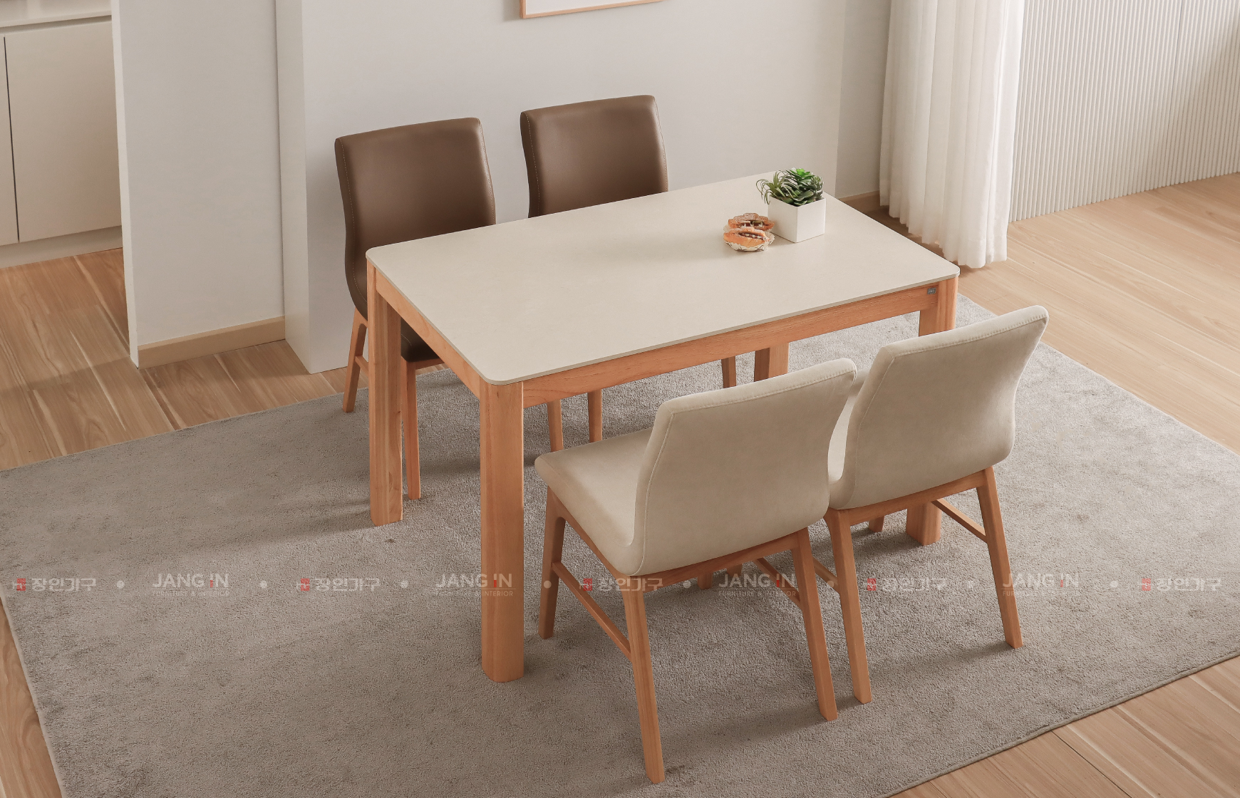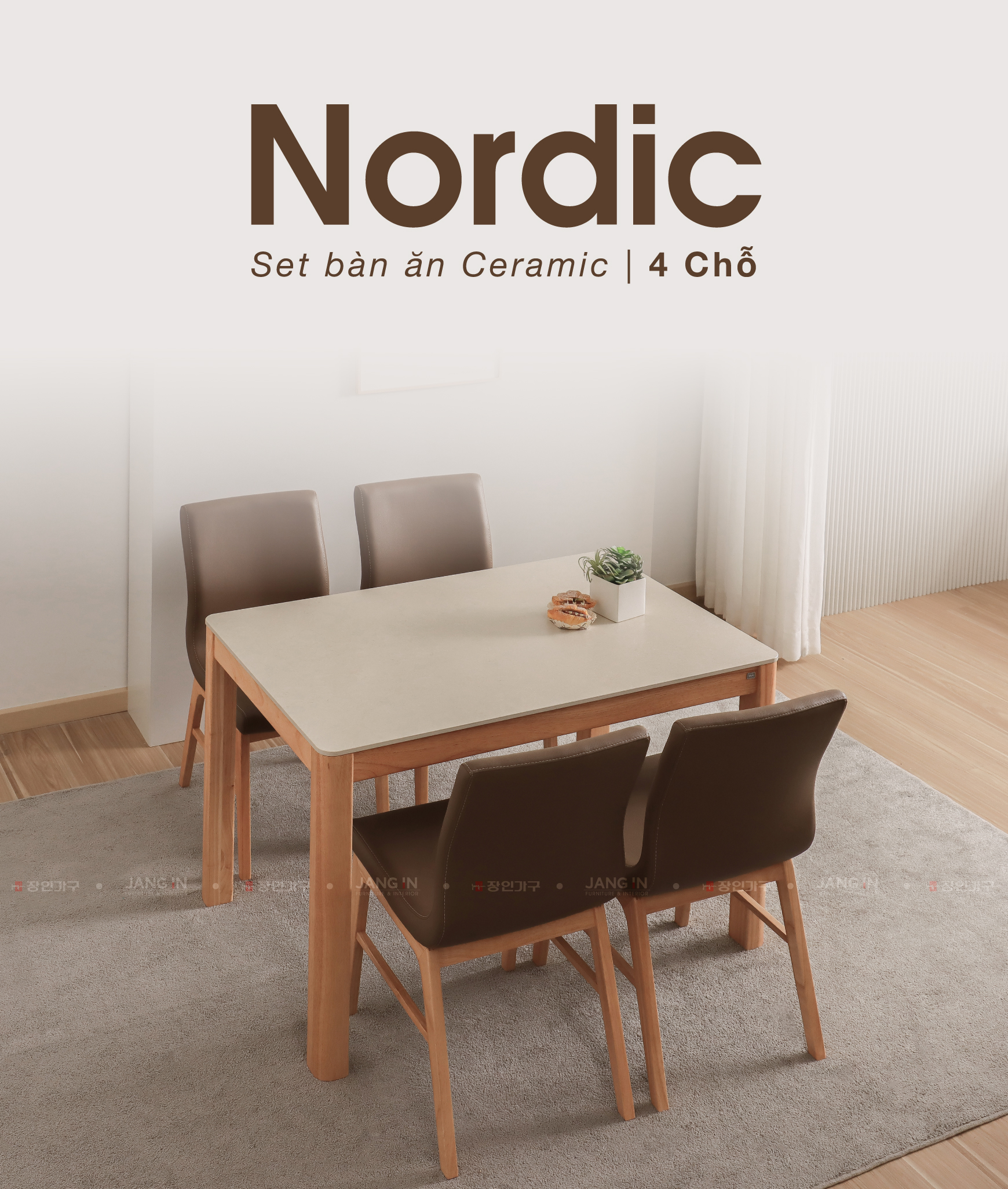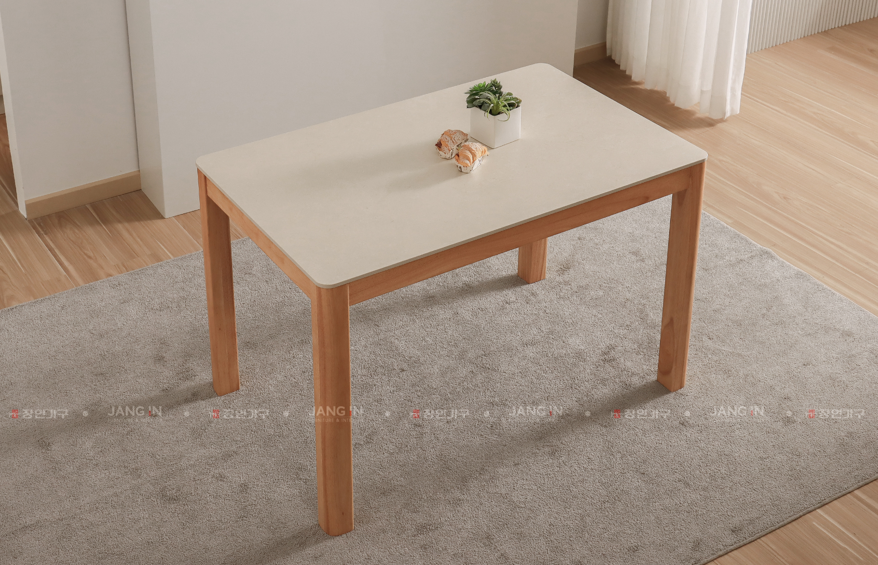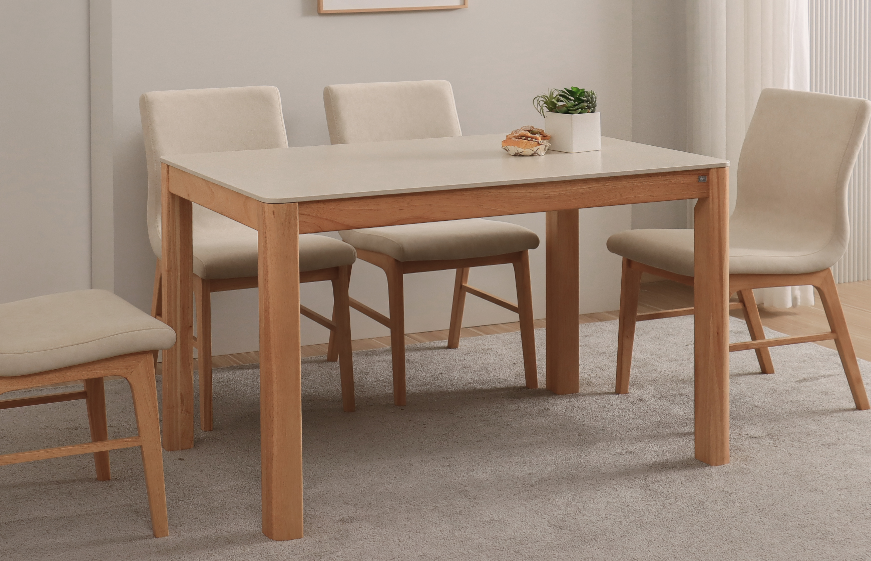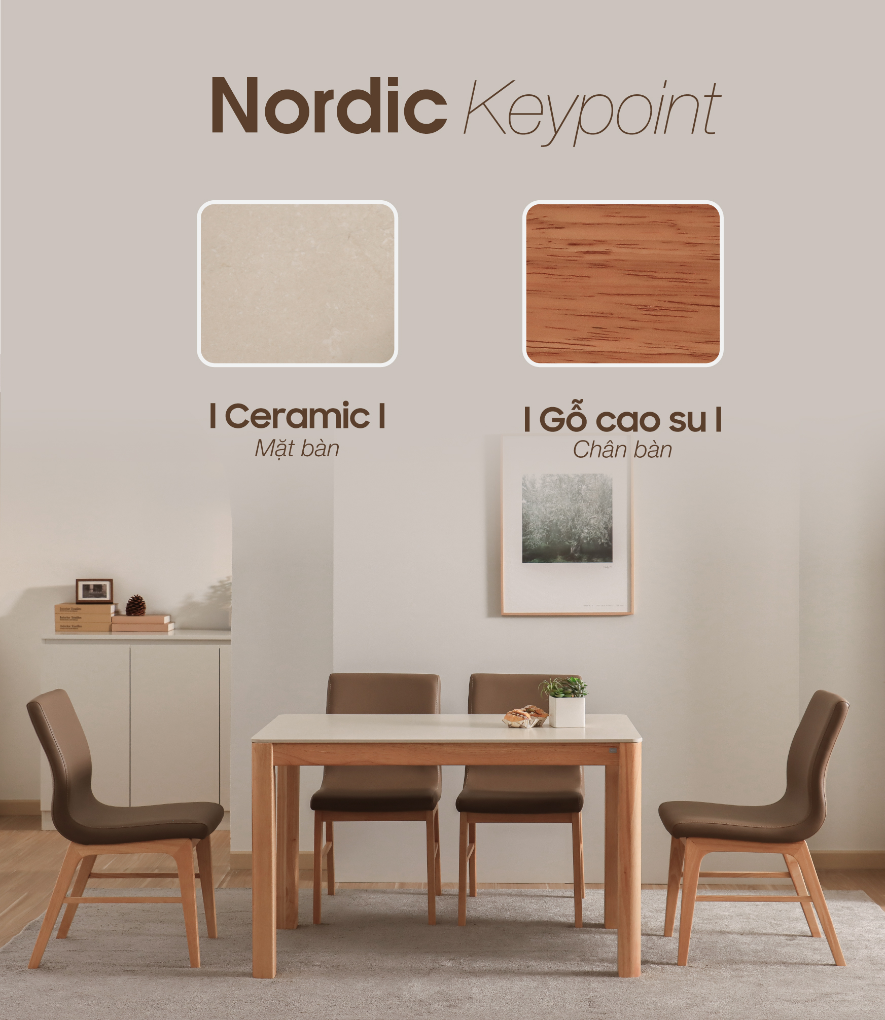 Bàn ăn Nordic 4 chỗ có mặt Ceramic Beige kết hợp khung gỗ cao su tự nhiên. Thiết kế đơn giản, dễ vệ sinh, phù hợp không gian bếp nhỏ gọn.
