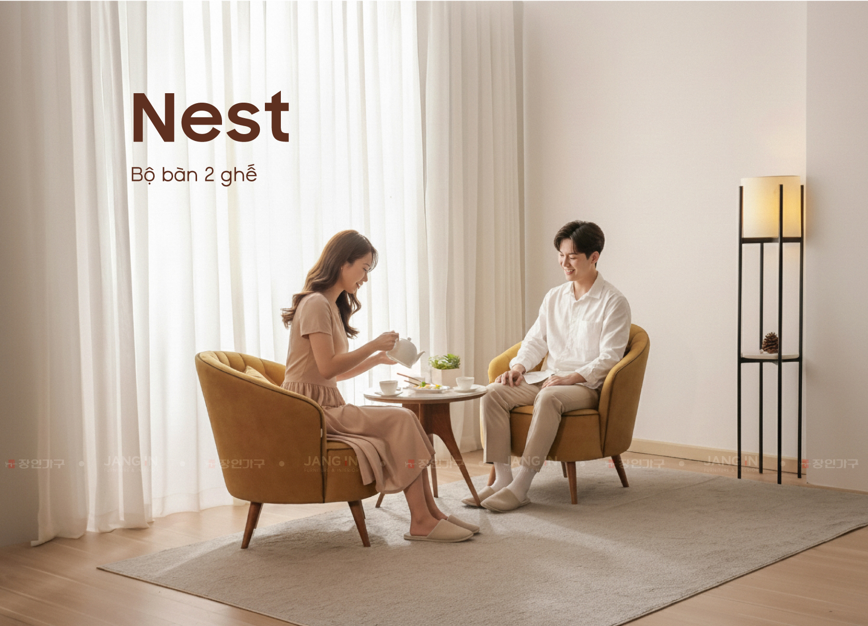 Bộ bàn trà Nest full set là sự kết hợp hoàn hảo giữa thẩm mỹ và công năng. Gồm hai ghế sofa đơn bọc vải hoặc da Silicon cao cấp cùng bàn tròn Ceramic mặt mịn sang trọng, Nest mang lại không gian tiếp khách hiện đại, ấm cúng và tinh tế. Khung gỗ tự nhiên bền chắc, thiết kế thanh thoát cùng gam màu trung tính giúp bộ sản phẩm dễ dàng hòa hợp với nhiều phong cách nội thất khác nhau, từ hiện đại đến tân cổ điển.
