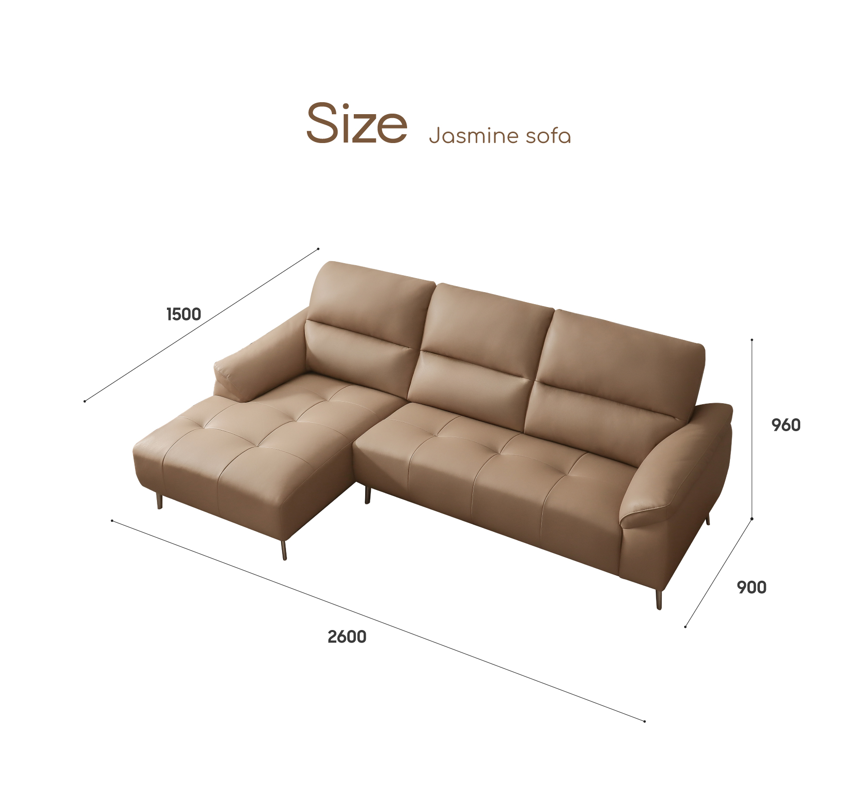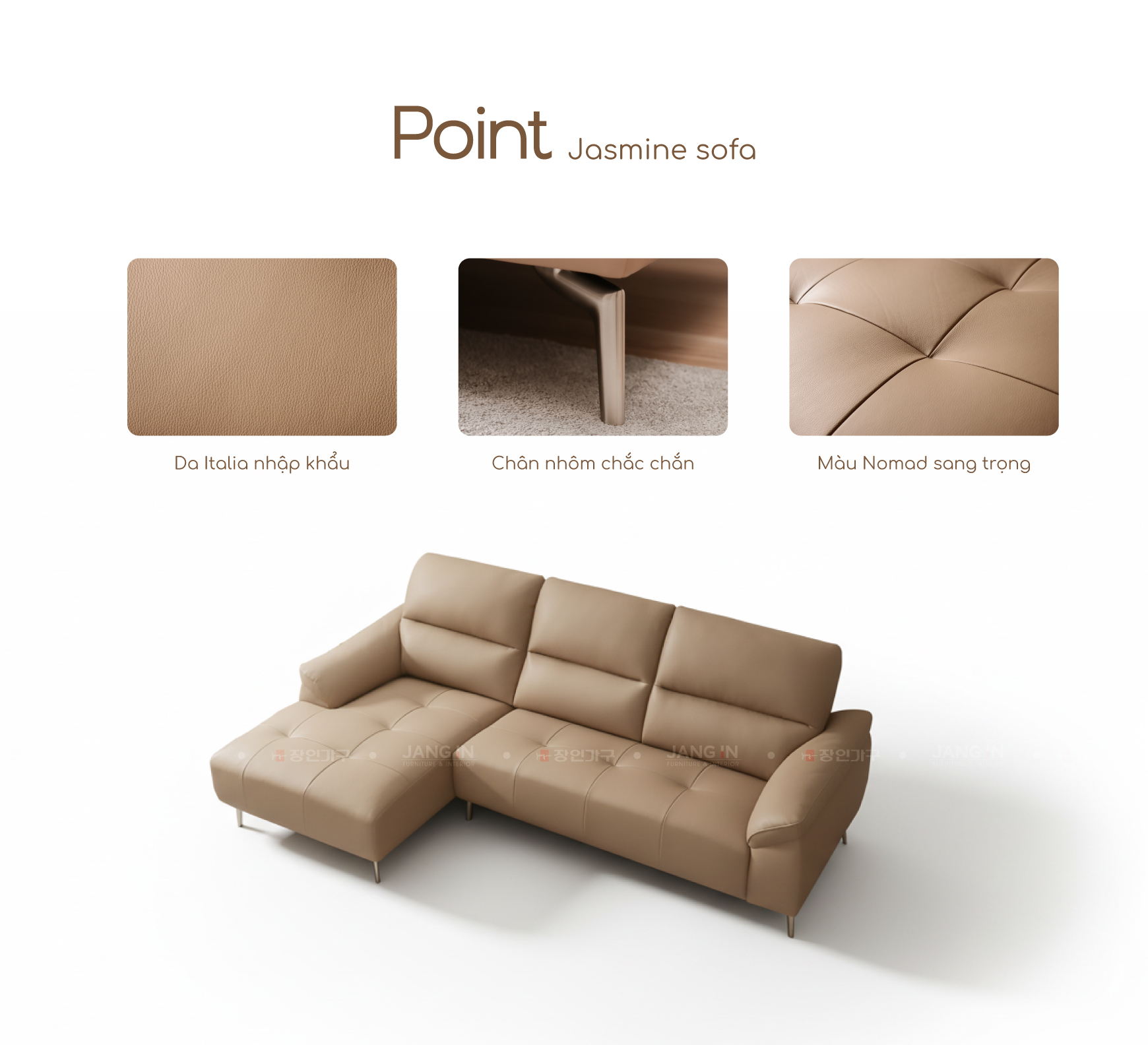 Sofa Jasmine mang phong cách hiện đại kết hợp da Italia cao cấp, mềm mát tạo sự thoải mái và phù hợp với không gian sống tinh tế. Tựa lưng được thiết kế nâng đỡ tối ưu cho cột sống, kết hợp với phần tay vịn rộng tạo sự thoải mái cả khi ngồi và nằm. Chân sofa bằng nhôm sáng bóng, giúp dễ dàng vệ sinh.
