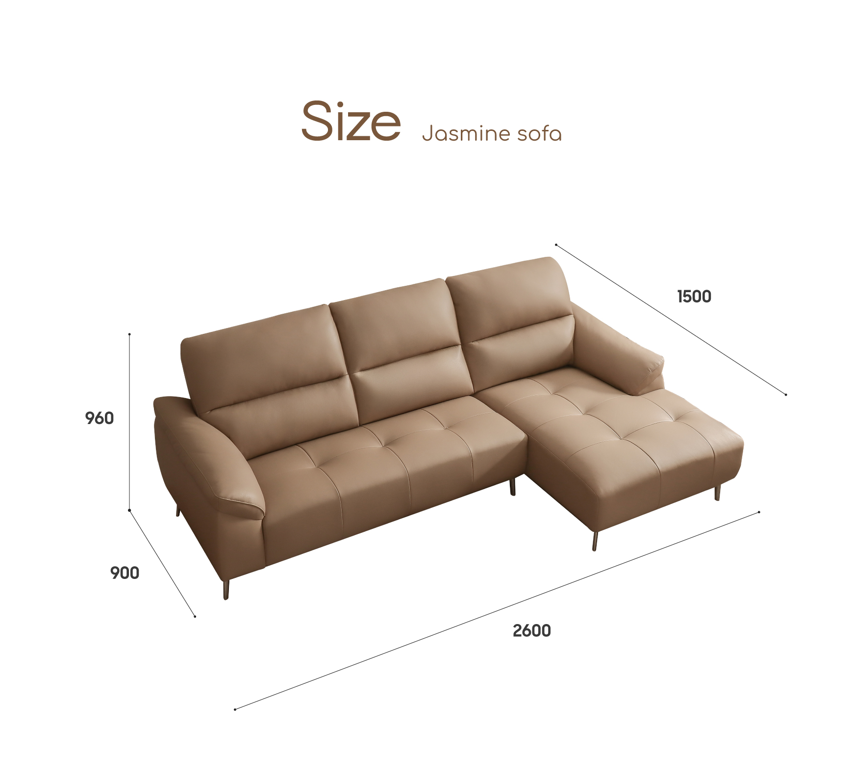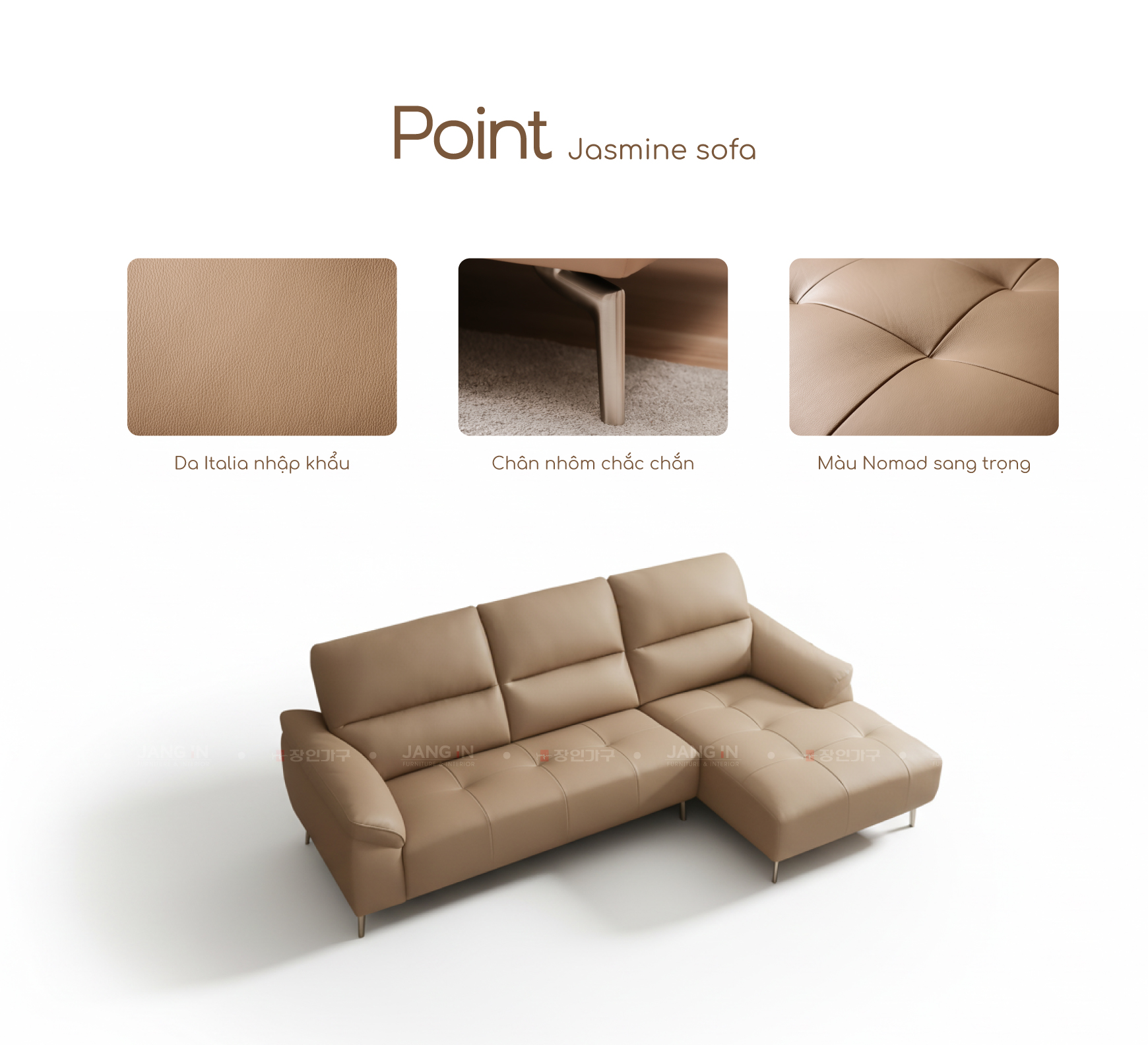 Sofa Jasmine mang phong cách hiện đại kết hợp da Italia cao cấp, mềm mát tạo sự thoải mái và phù hợp với không gian sống tinh tế. Tựa lưng được thiết kế nâng đỡ tối ưu cho cột sống, kết hợp với phần tay vịn rộng tạo sự thoải mái cả khi ngồi và nằm. Chân sofa bằng nhôm sáng bóng, giúp dễ dàng vệ sinh.