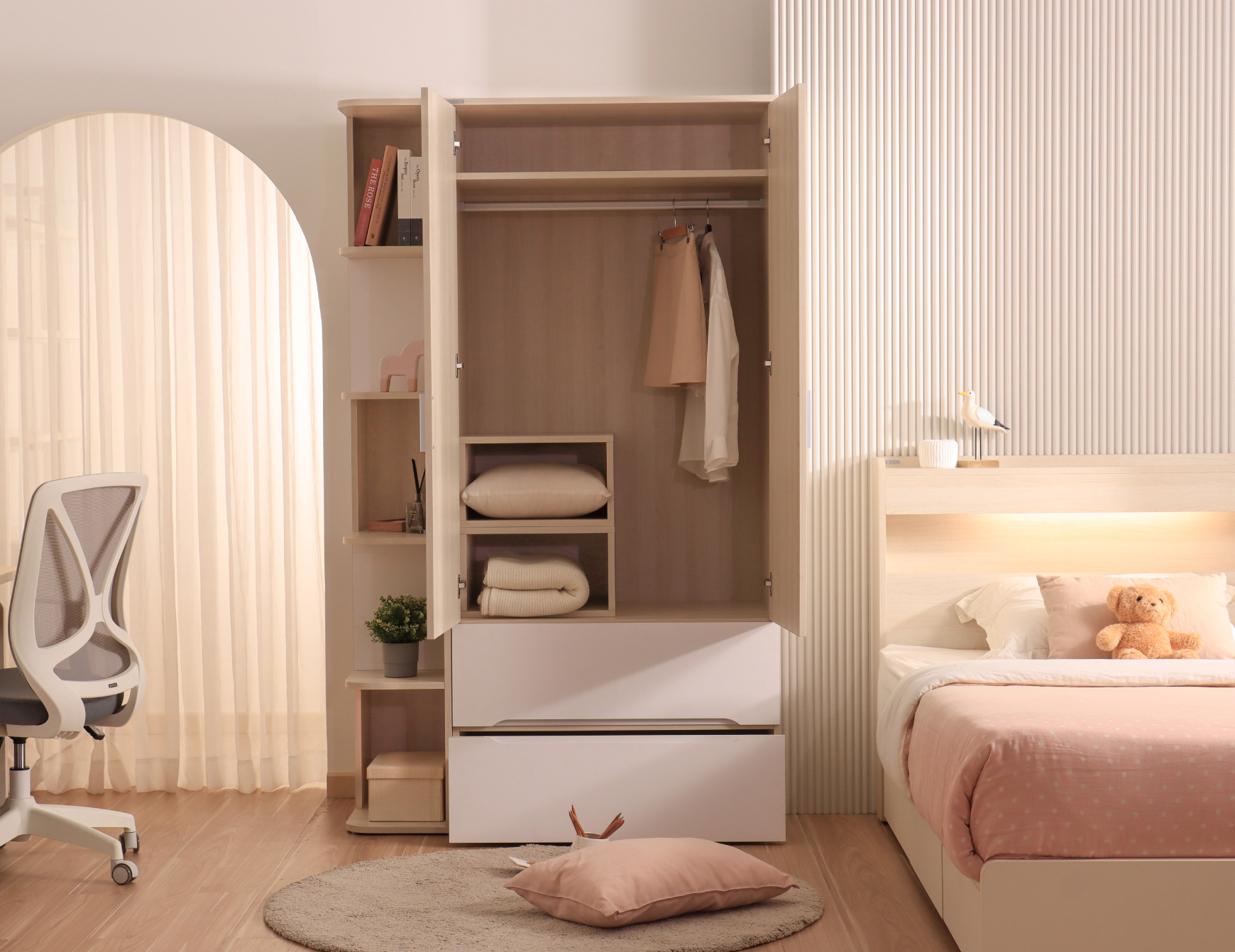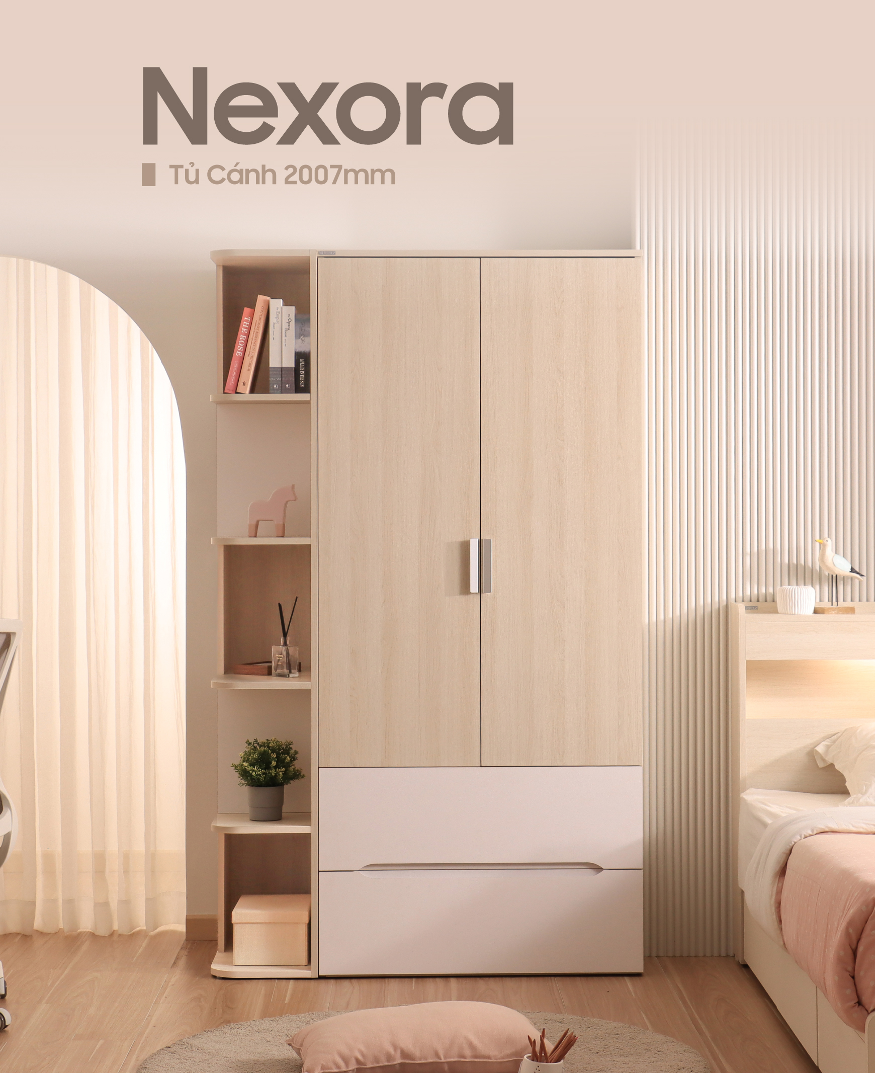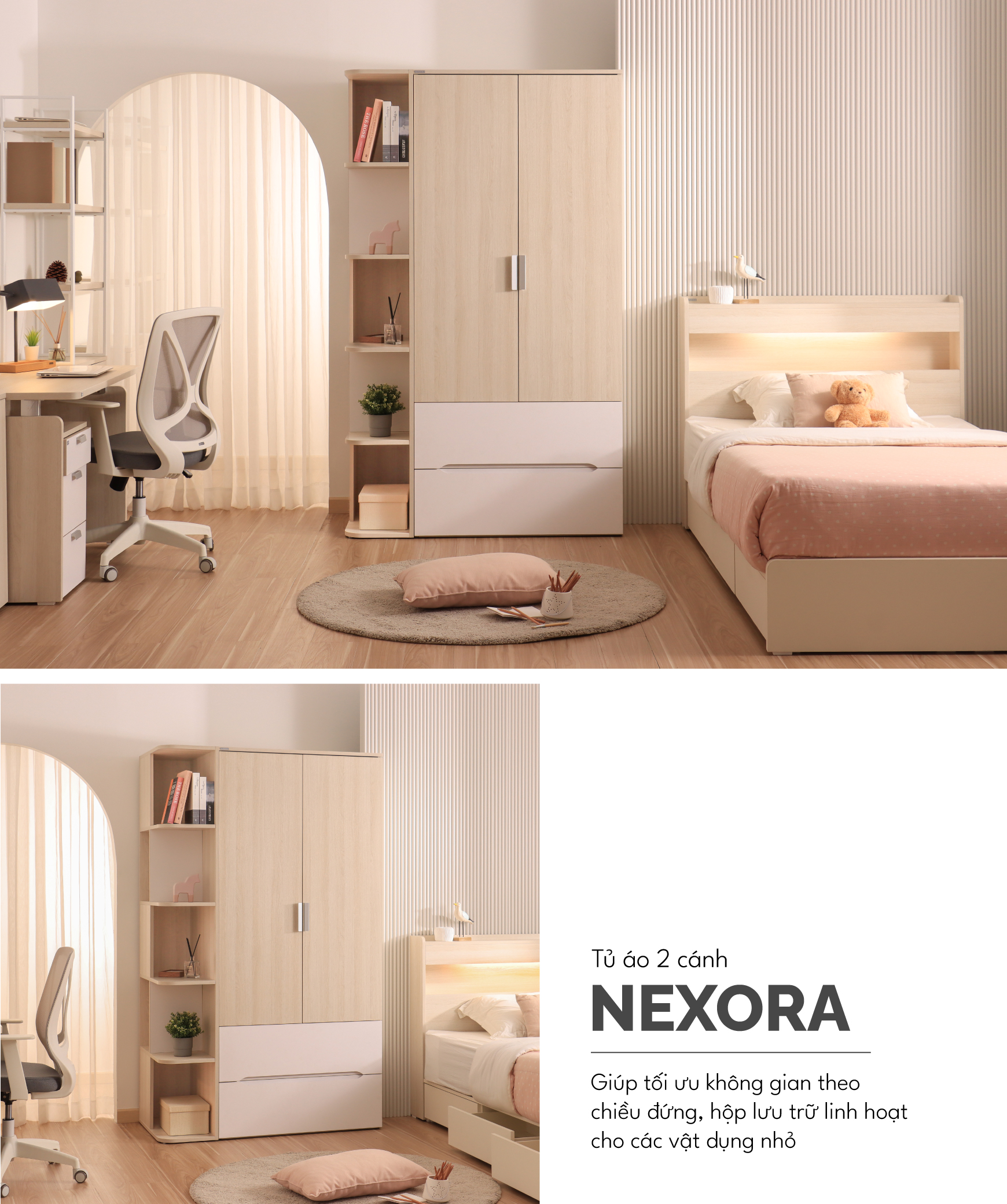 Bộ tủ Nexora bao gồm tủ áo 2 cánh, tủ kệ và hộp lưu trữ, được thiết kế đồng bộ với màu gỗ sáng và kiểu dáng hiện đại. Tủ áo và tủ kệ có chiều cao tương thích, tạo sự liền mạch khi bố trí liền kề. Hộp lưu trữ nhỏ gọn, dễ dàng đặt trong tủ hoặc sử dụng riêng. Toàn bộ sản phẩm sử dụng chất liệu chất liệu thân thiện, đảm bảo an toàn trong thời gian sử dụng, vừa đảm bảo tính thẩm mỹ, vừa thuận tiện trong quá trình sử dụng và bảo quản.
