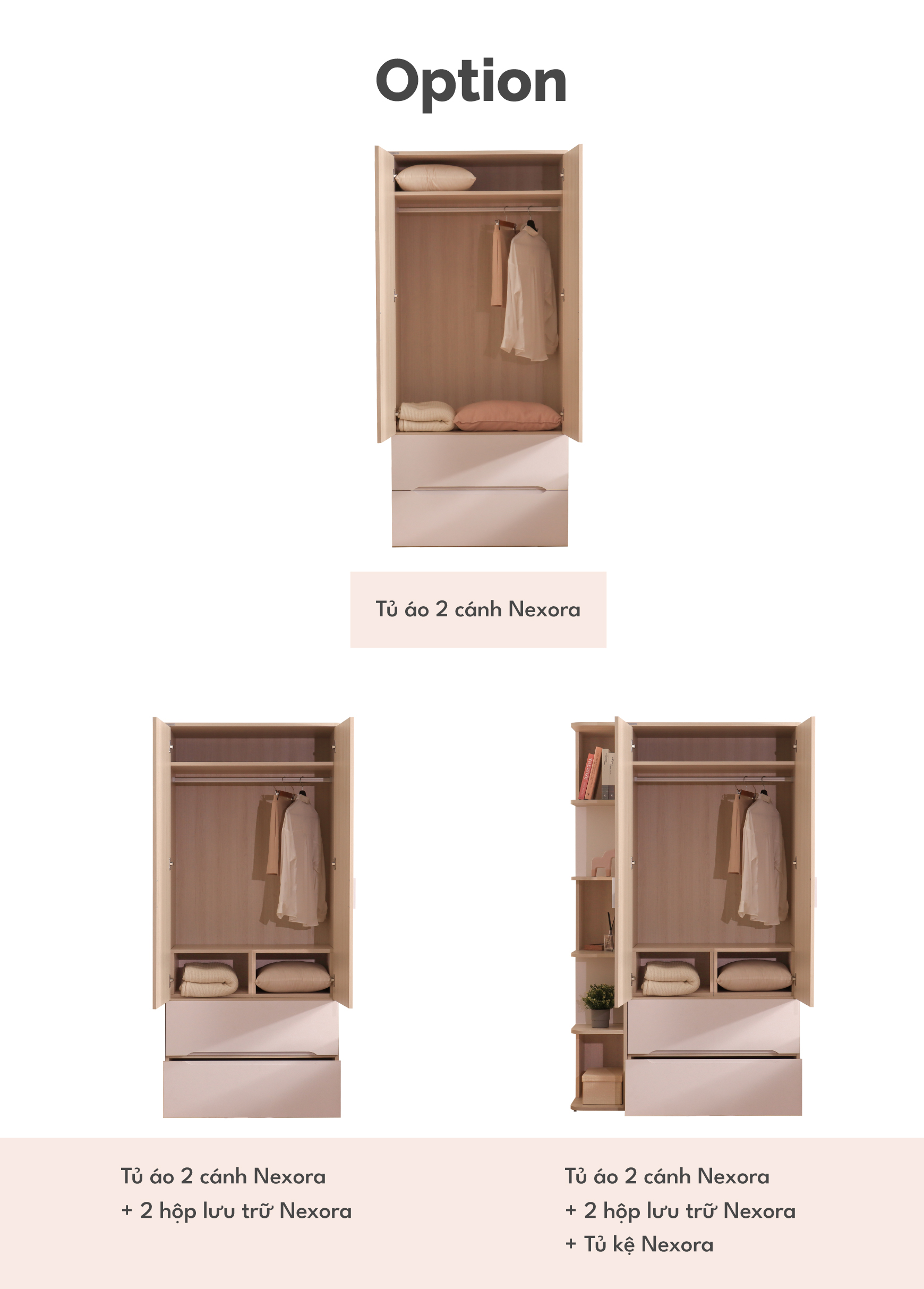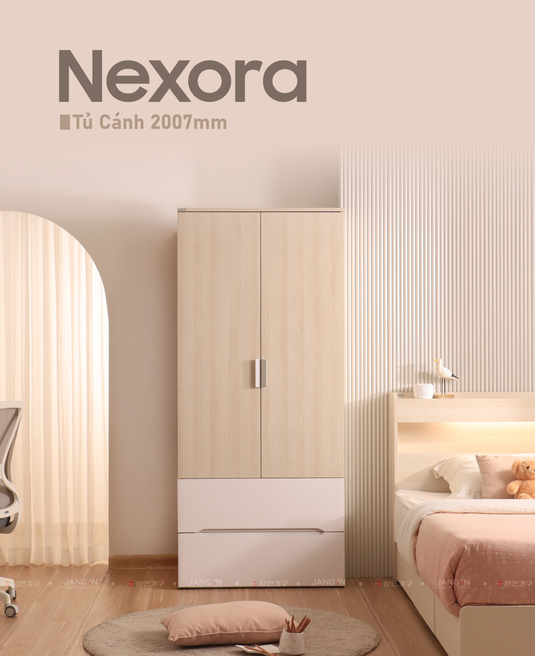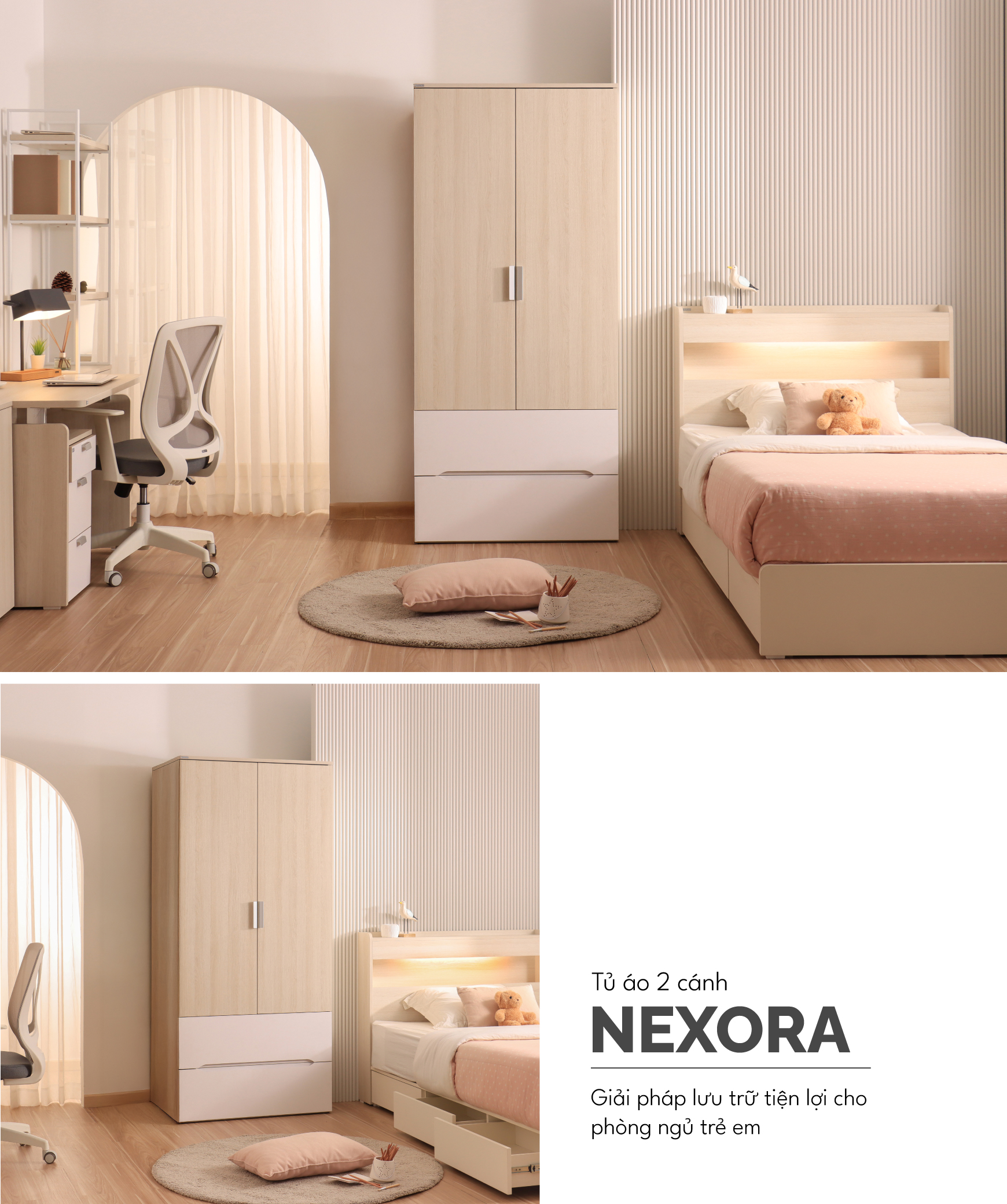 Tủ áo 2 cánh Nexora là giải pháp lưu trữ tiện lợi cho phòng ngủ trẻ em, với thiết kế đơn giản, màu sắc tươi sáng và chiều cao tối ưu. Tủ có kết cấu chắc chắn, chất liệu thân thiện, đảm bảo an toàn trong thời gian sử dụng. Chống trầy xước và dễ bảo quản. Sản phẩm mang đến không gian ngăn nắp, dễ phối hợp cùng các sản phẩm khác trong bộ nội thất Nexora.
