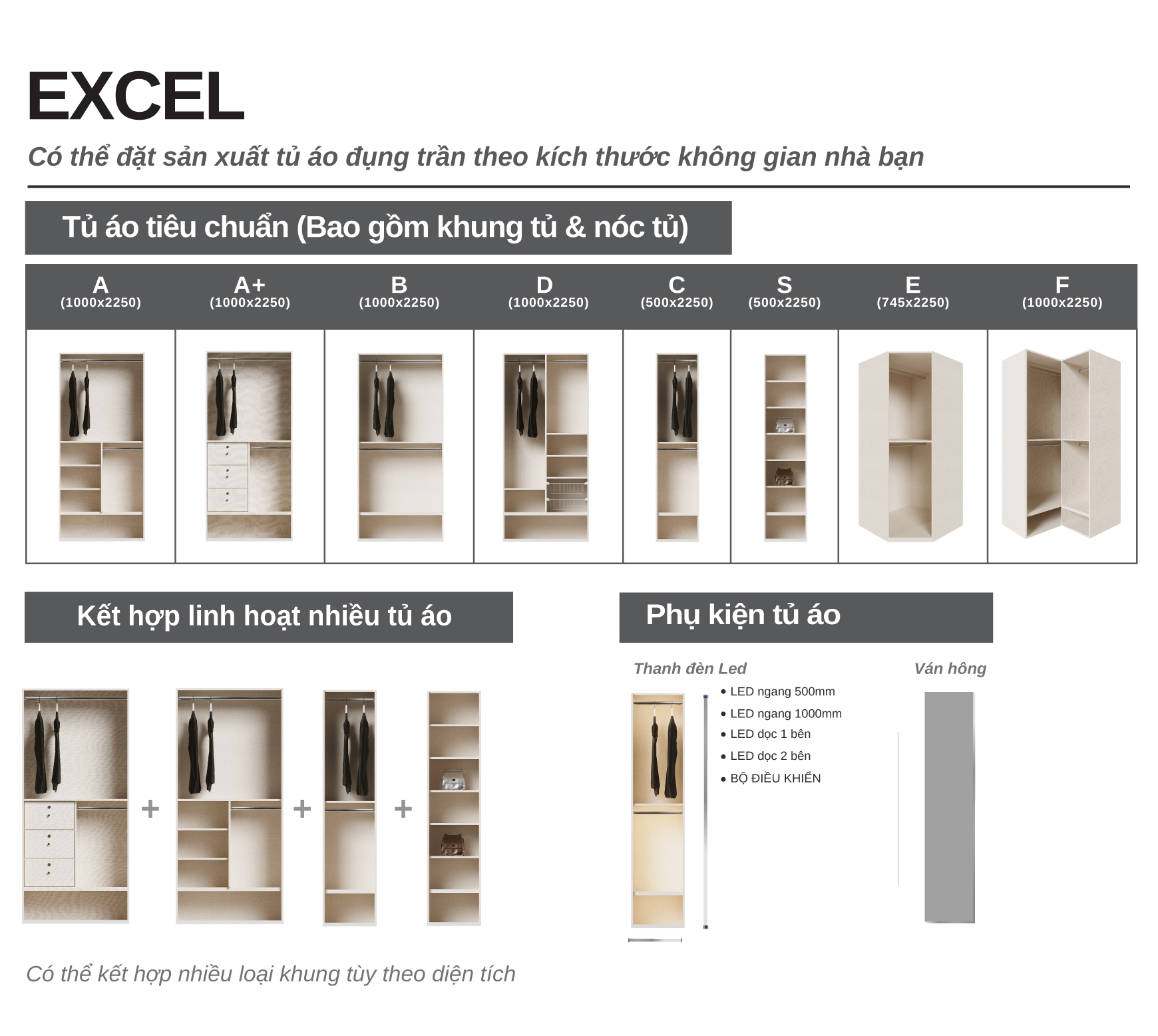 Tủ được thiết kế với 2 loại : Tủ kích thước thường & Tủ đụng trần giúp người dùng dễ dàng lựa chọn