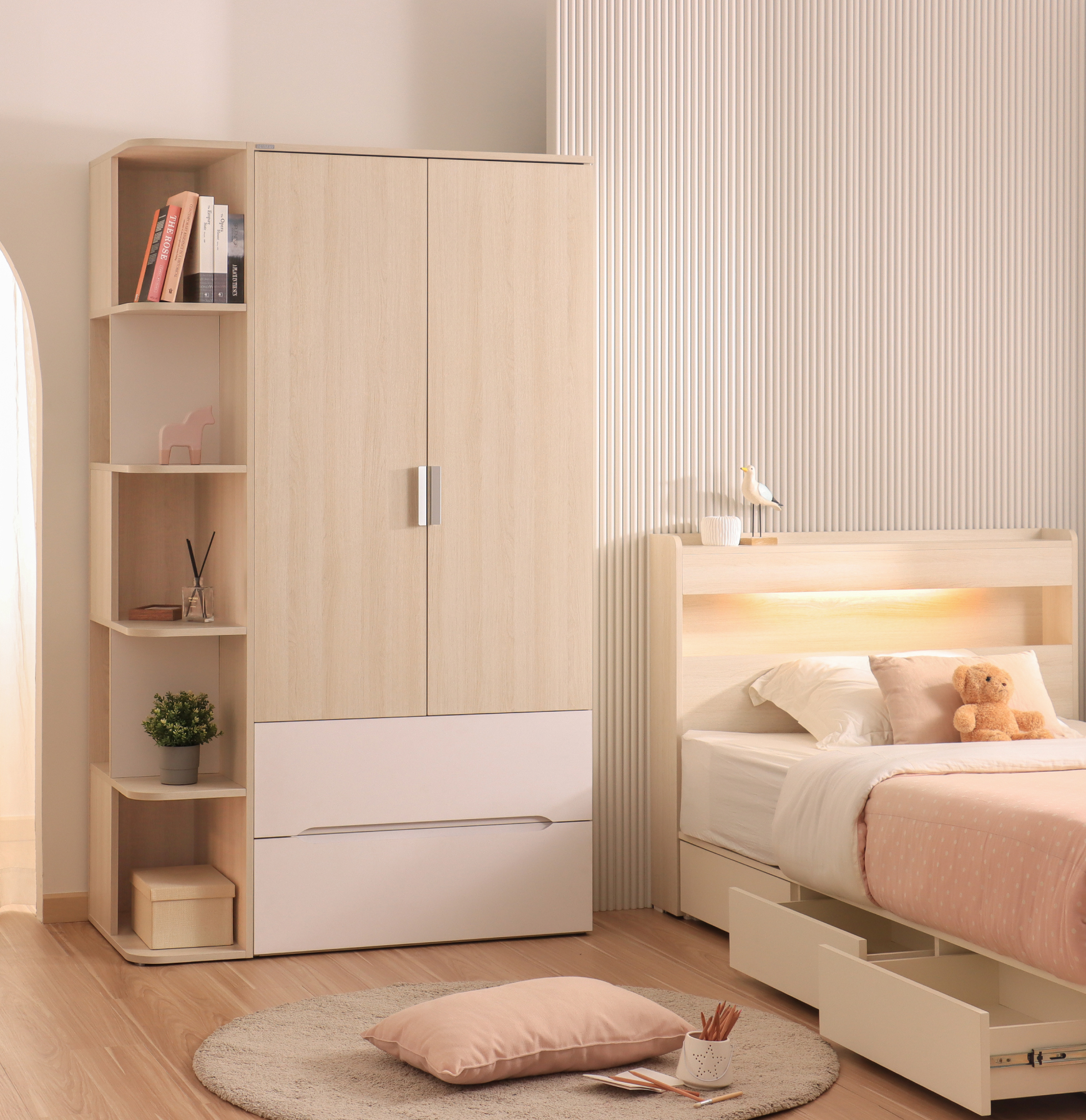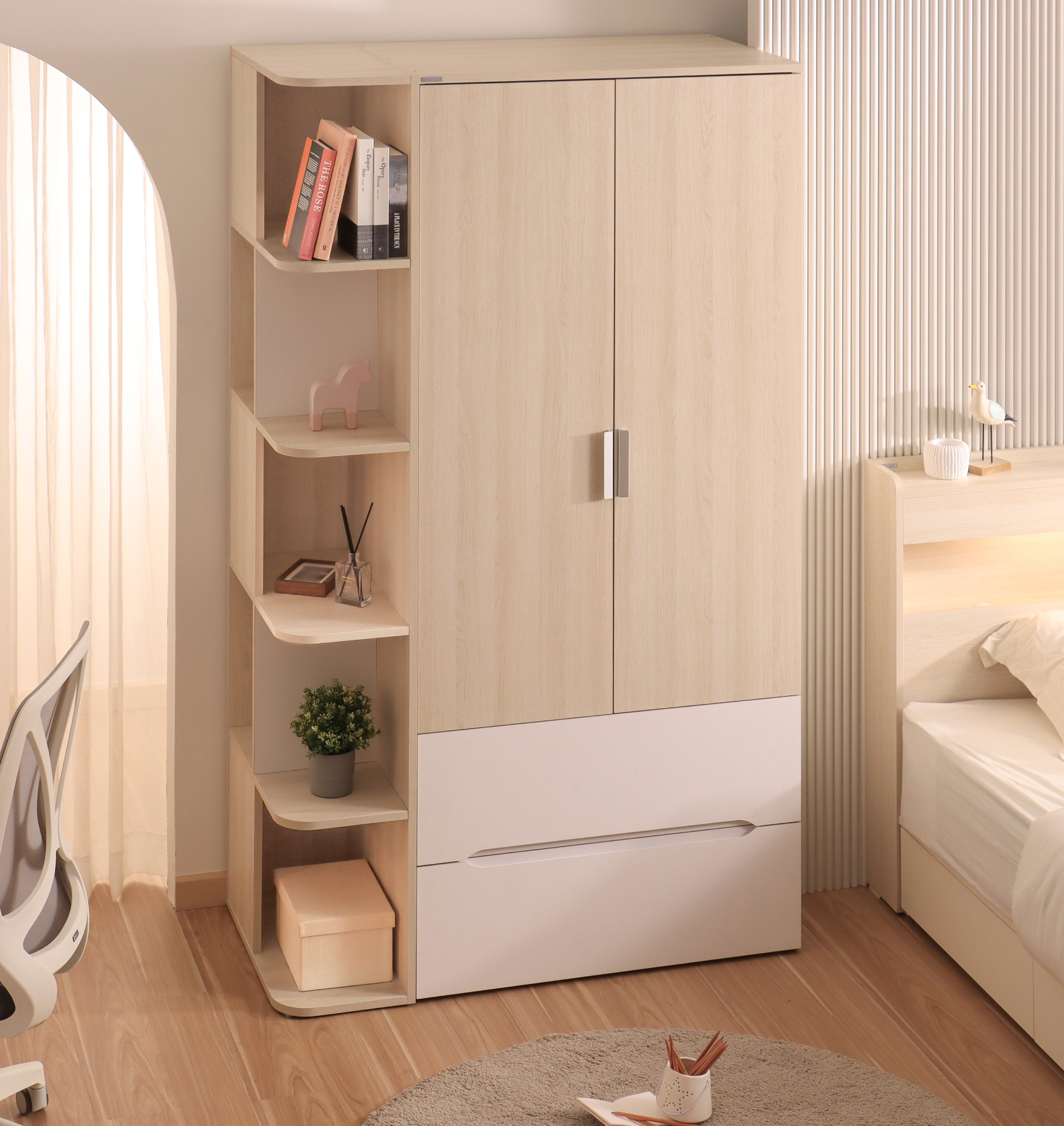 Tủ kệ Nexora được thiết kế cao, thon gọn với tone màu gỗ sáng, phù hợp cho không gian phòng ngủ hoặc học tập của trẻ. Với chiều cao tương đương tủ áo, sản phẩm dễ dàng kết hợp thành hệ tủ liền mạch hoặc sử dụng độc lập như một kệ lưu trữ đa năng. Thiết kế gồm nhiều khoang giúp sắp xếp sách, hộp lưu trữ hoặc đồ dùng trang trí một cách gọn gàng. Chất liệu thân thiện, đảm bảo an toàn trong thời gian sử dụng, độ bền và khả năng vệ sinh cao.