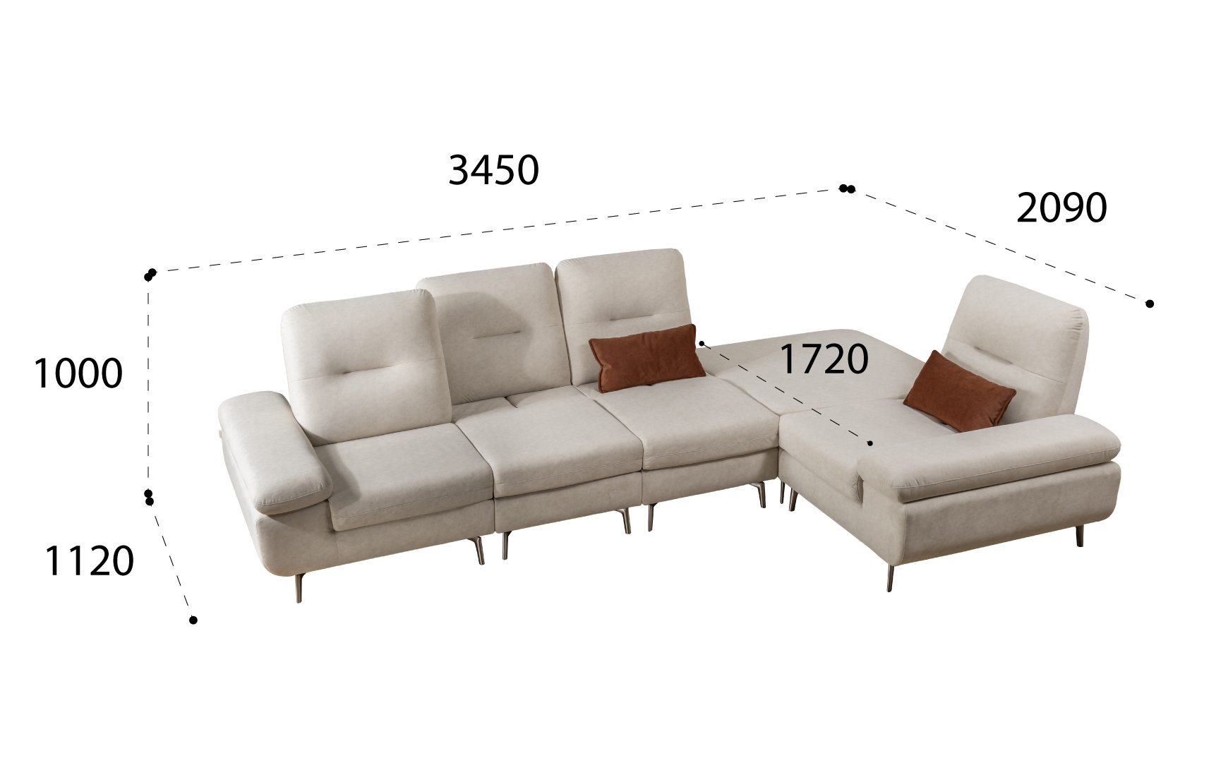 Sofa 6 chỗ góc: 3450*1120(2090)*1000H |