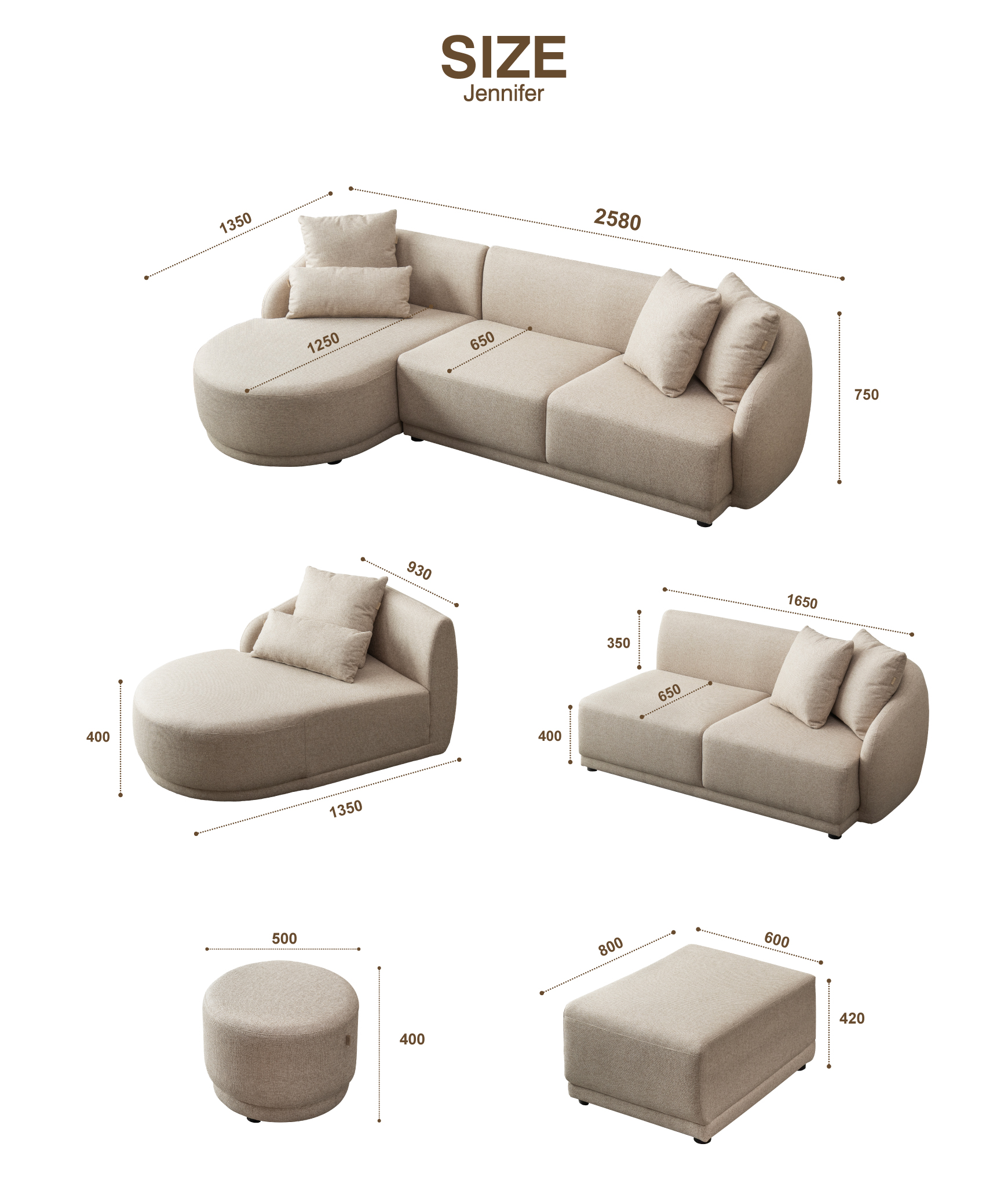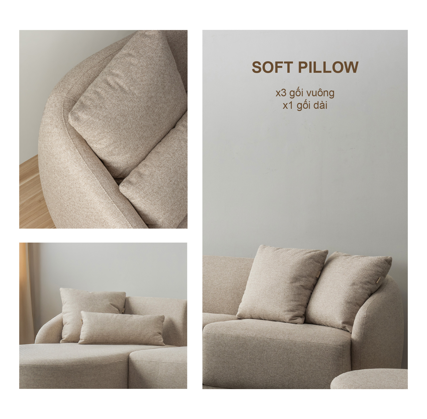 Sofa trường kỷ Jennifer được thiết kế theo phong cách Wabi-sabi, nổi bật với những đường bo cong mềm mại, tạo nên vẻ đẹp mộc mạc nhưng vẫn đầy tinh tế. Sản phẩm được bọc vải sợi dệt nhập khẩu cao cấp, đạt chứng nhận OEKO-TEX Standard 100, an toàn cho người sử dụng và thân thiện với môi trường.