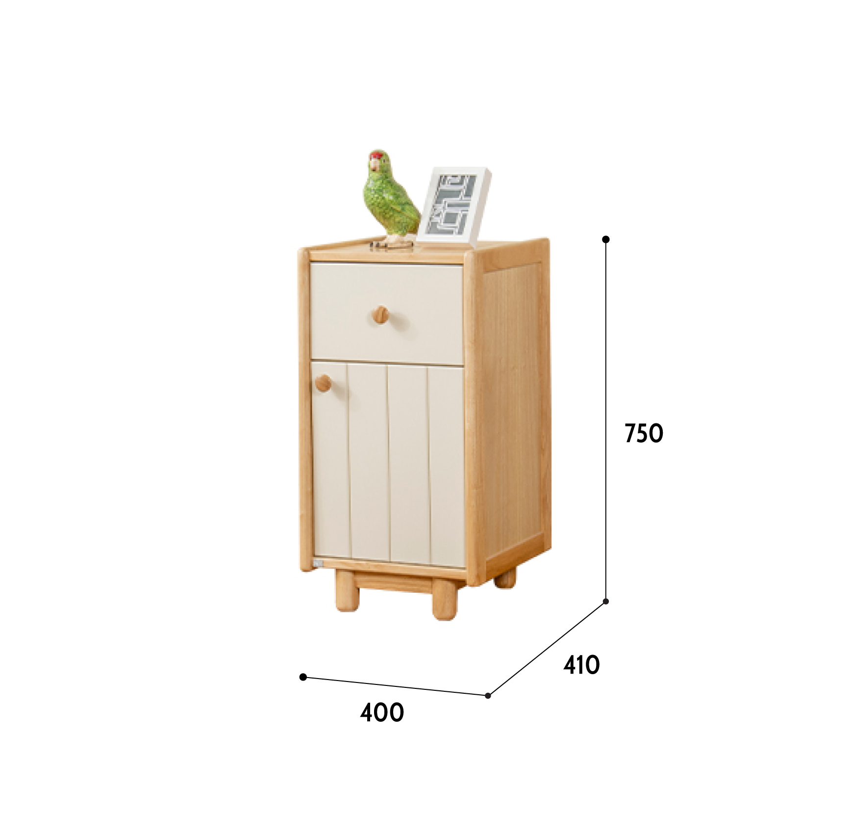 Những đường vân gỗ tự nhiên tạo điểm nhấn tinh tế, đồng thời mang lại cảm giác dễ chịu cho căn phòng. Với kích thước dài 400mm, sâu 410mm, cao 750mm, tủ It’s Me phù hợp để lưu trữ đồ dùng học tập hoặc quần áo, đáp ứng nhu cầu sinh hoạt hằng ngày của bé.