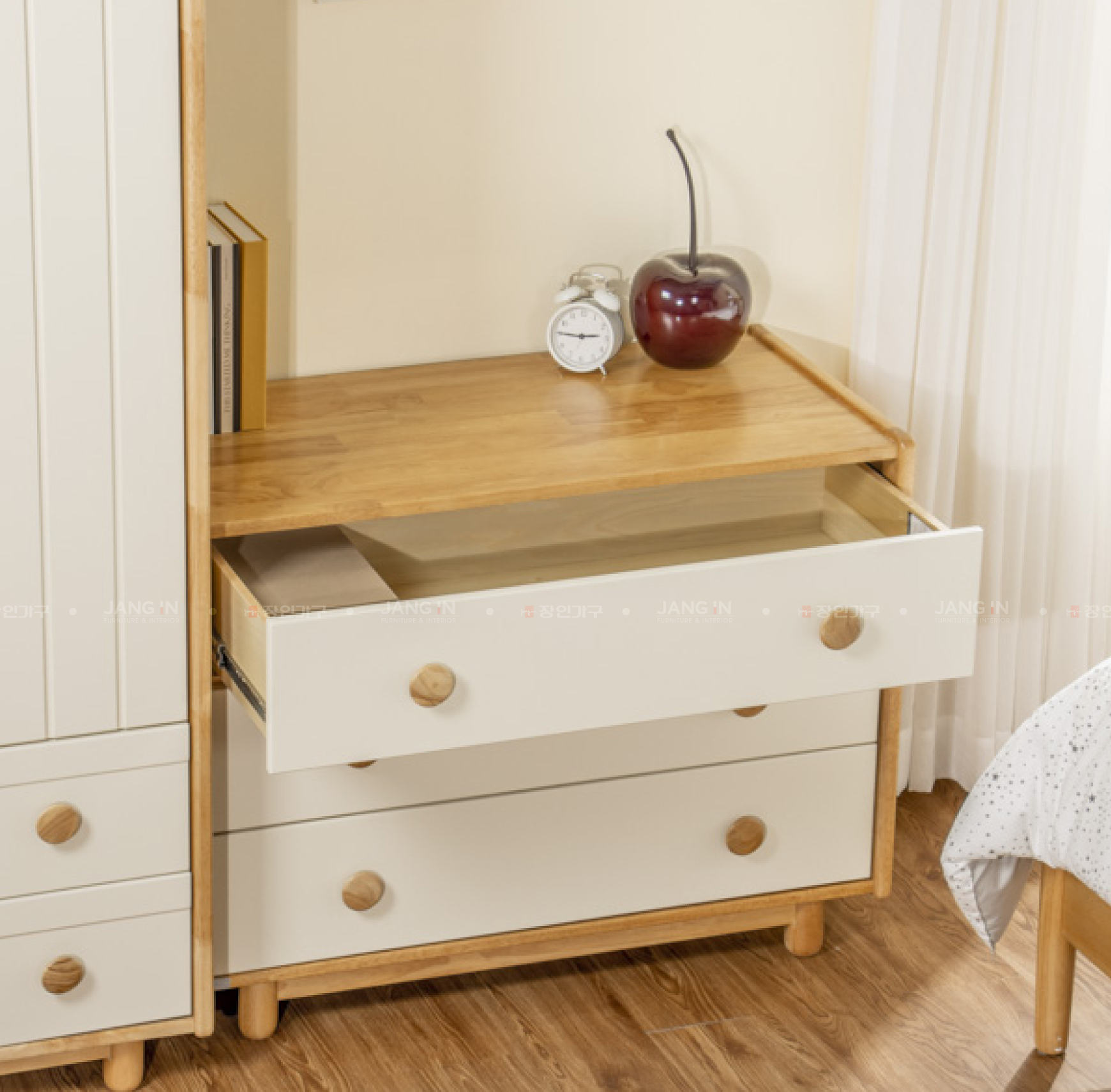 Các góc cạnh được mài tỉ mỉ, bo tròn bóng mượt, đảm bảo an toàn khi trẻ sử dụng. Những đường vân gỗ tự nhiên trở thành điểm nhấn tinh tế, đồng thời tạo cảm giác dễ chịu và thân thiện cho căn phòng.